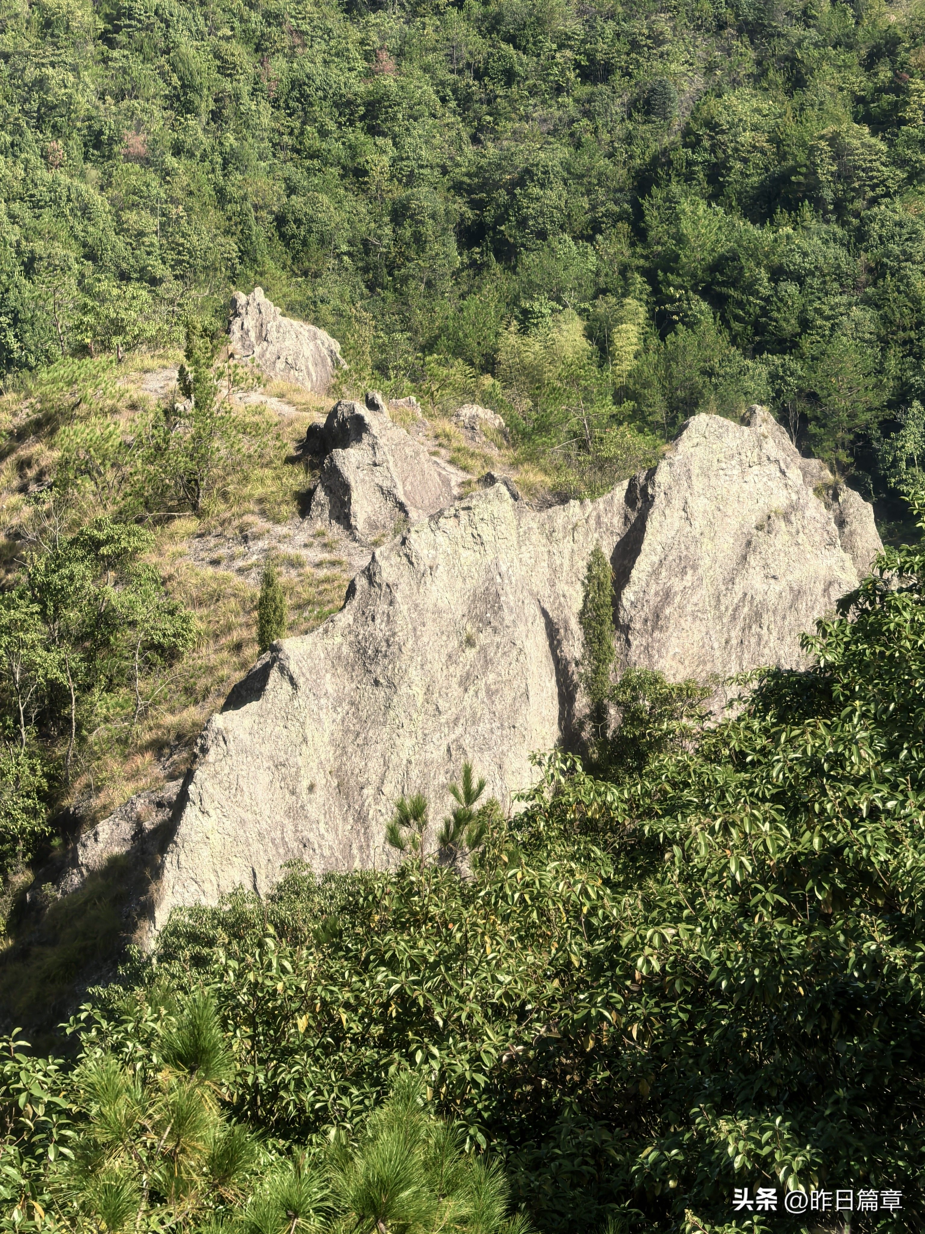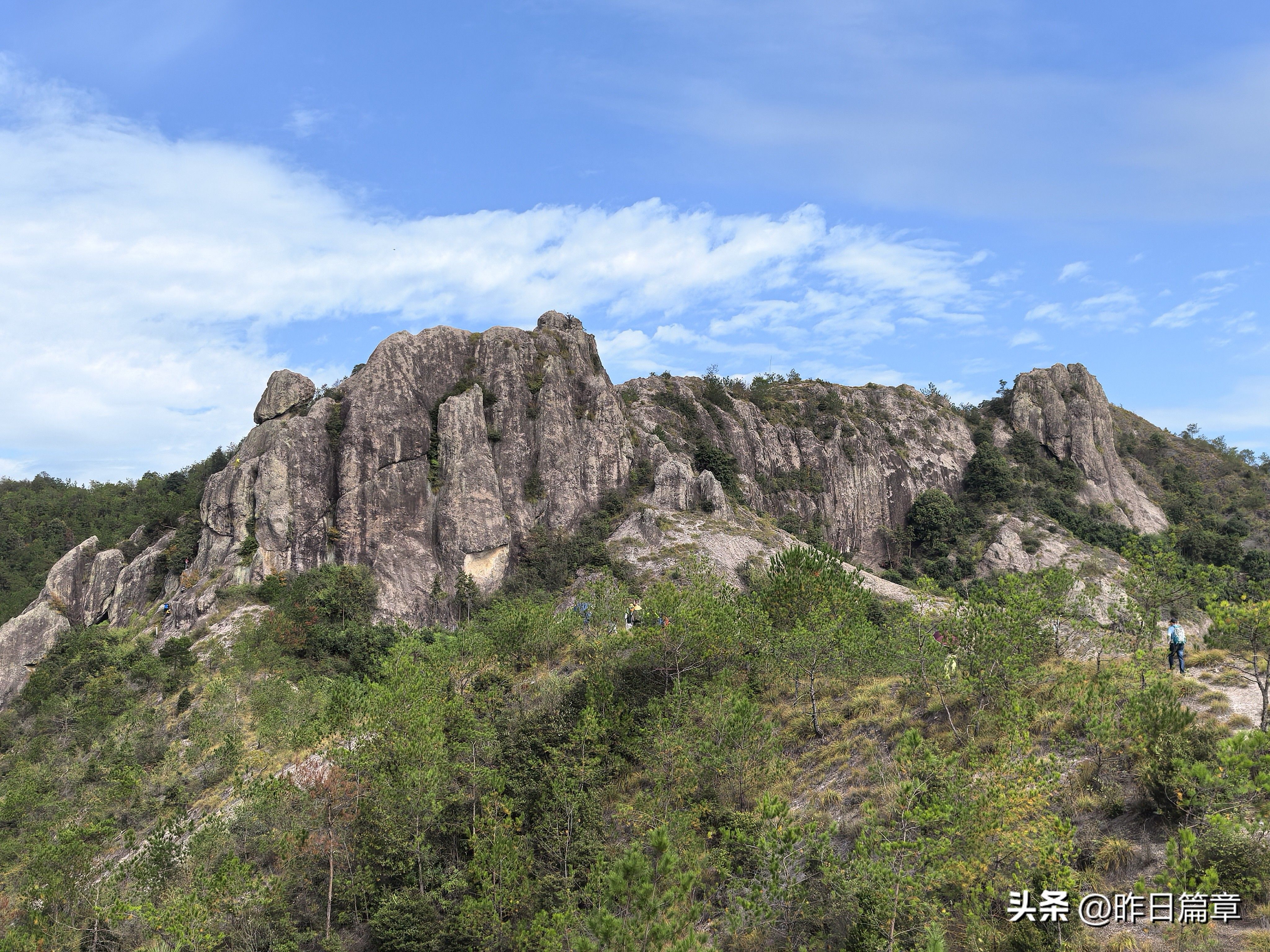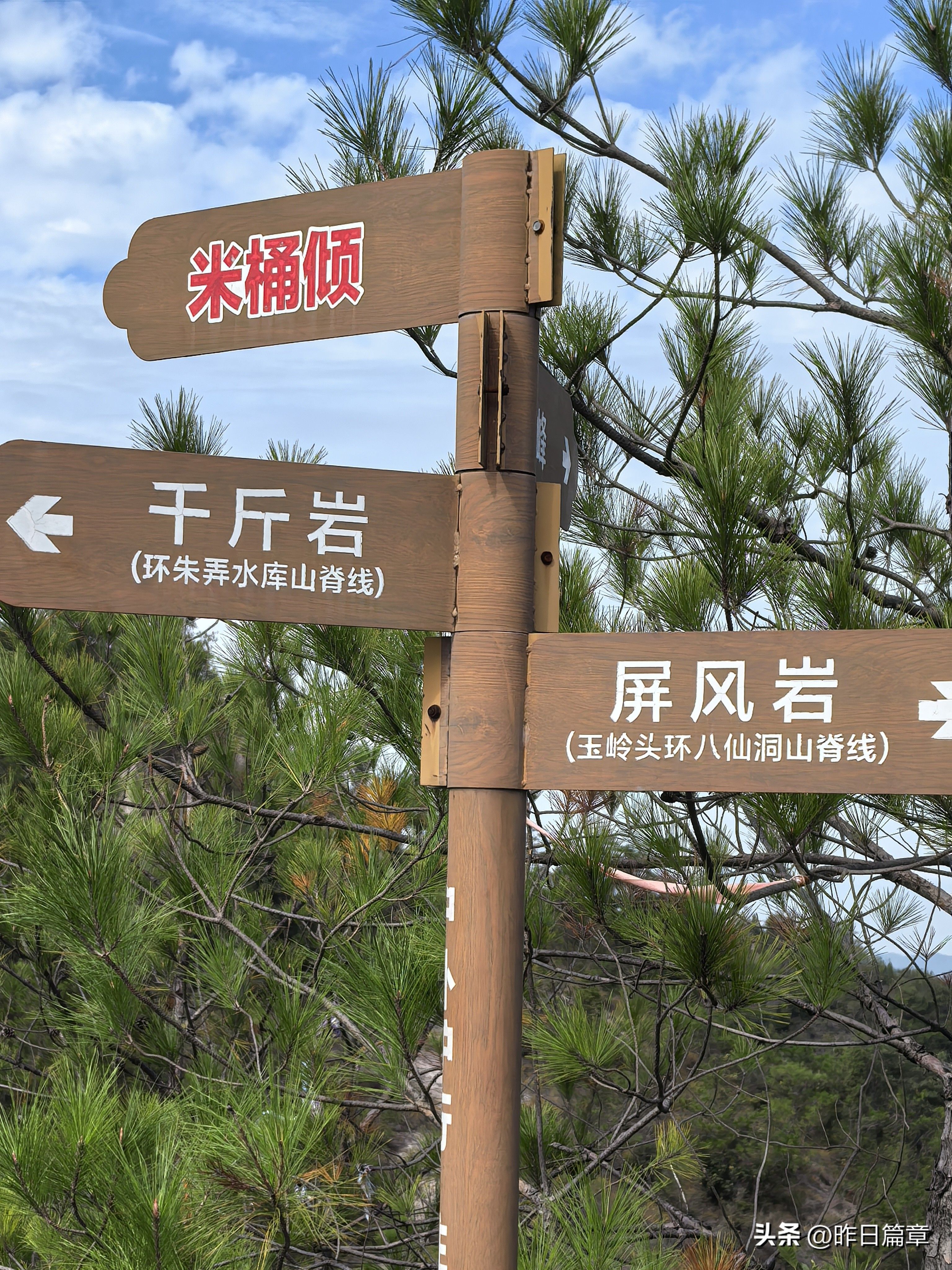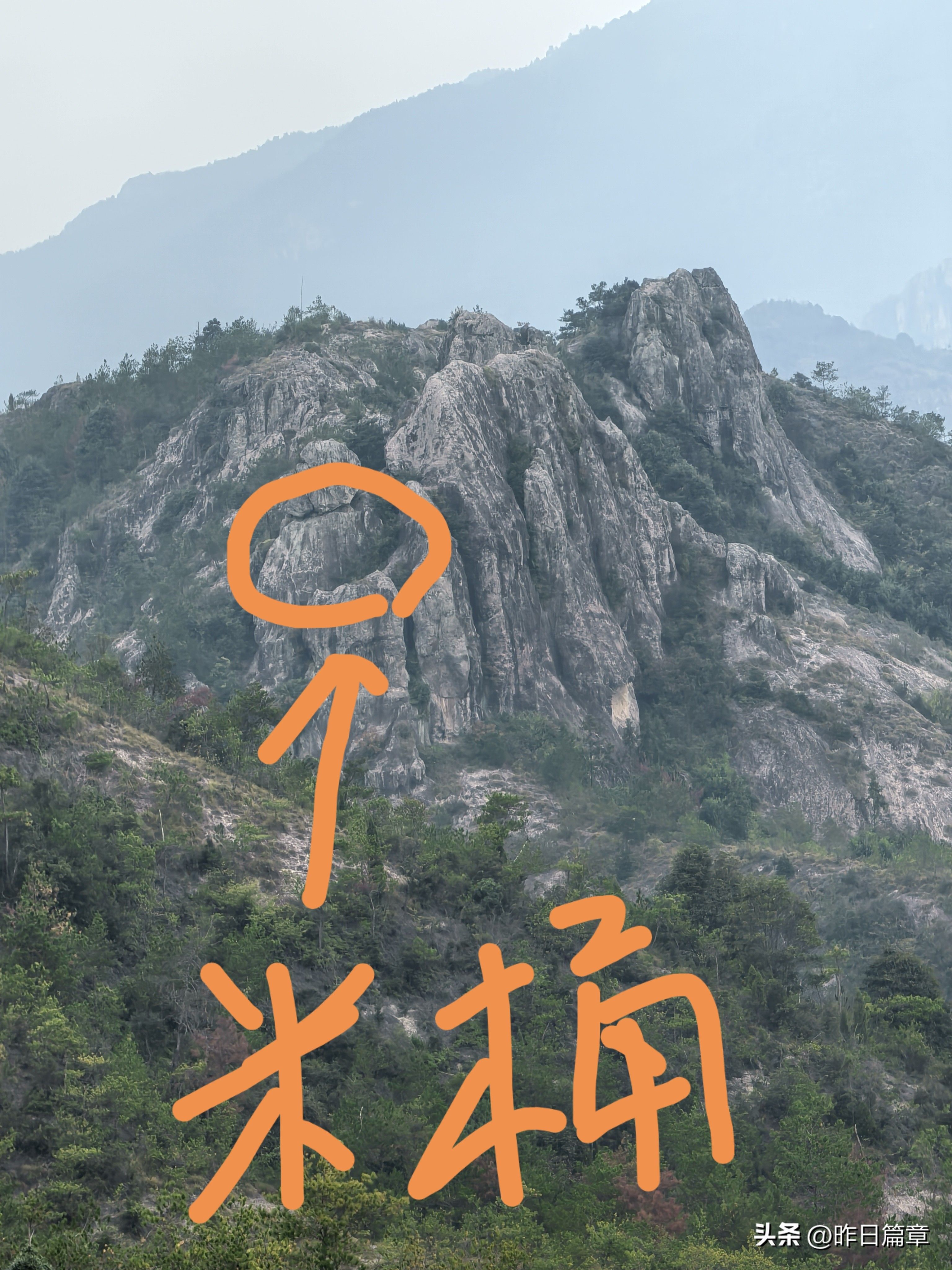 大客车停平黄公路缙云综合治超点附近公路边。我们沿公路北面去朱弄水库方向的水泥路徒步220米左右,右面有上山的环浙步道登山路标,朝朱弄水库和洪岭脚方向走,穿过山脚一片茂密的树林,就是岩板山。一个巨大石柱(当地人称其为千斤岩)孤悬在岩板上。拍照打卡后继续攀上小山顶,环顾四周,大都是岩板裸露,植被稀疏,脚下是风化的碎石。左边谷底是狭长的朱弄水库。远眺左对面山脊背有二座石峰蛮好看,一座像一丛蔴菇,另一座不知像啥。我用华为P70pro的远摄镜头拍下一看,像蔴菇的那座石峰也像骆驼,当地人标为驼峰,另一座不知像啥的拍下一看,像乌龟,看得清乌龟头(当地人标称龟峰)。继续沿山脊环浙步道徒步,前面的悬崖峭壁挡住去路。得益于全民健身运动,政府在不易攀登的地方固定了铁链。大家依领队的吩咐,强弱间个攀登到顶,在峰顶向北远眺,那座又高又尖的山峰就是我和老张曾经登顶的新屋村后山,向来时方向俯瞰,山脊驴道清晰可见,朱弄水库一览无余。广告牌标示:缙云驴道,环朱弄水库山脊线。我们从顶峰下来沿山脊走一点路,有个路牌,标示此处地名“米桶倾”,我不知为什么起这个名?路牌一面指示,千斤岩方向,一面指向龟峰,一面指向屏风岩,屏风岩三字下面括号标注玉岭头八仙洞环脊线。由此看来,环朱弄水库山脊线,只能欣赏千斤岩、米桶倾、龟峰、骆驼峰四景。领队将我们带向屏风岩方向,再走玉岭头八仙洞环脊线。玉岭头八仙洞环脊线有哪些景点呢?