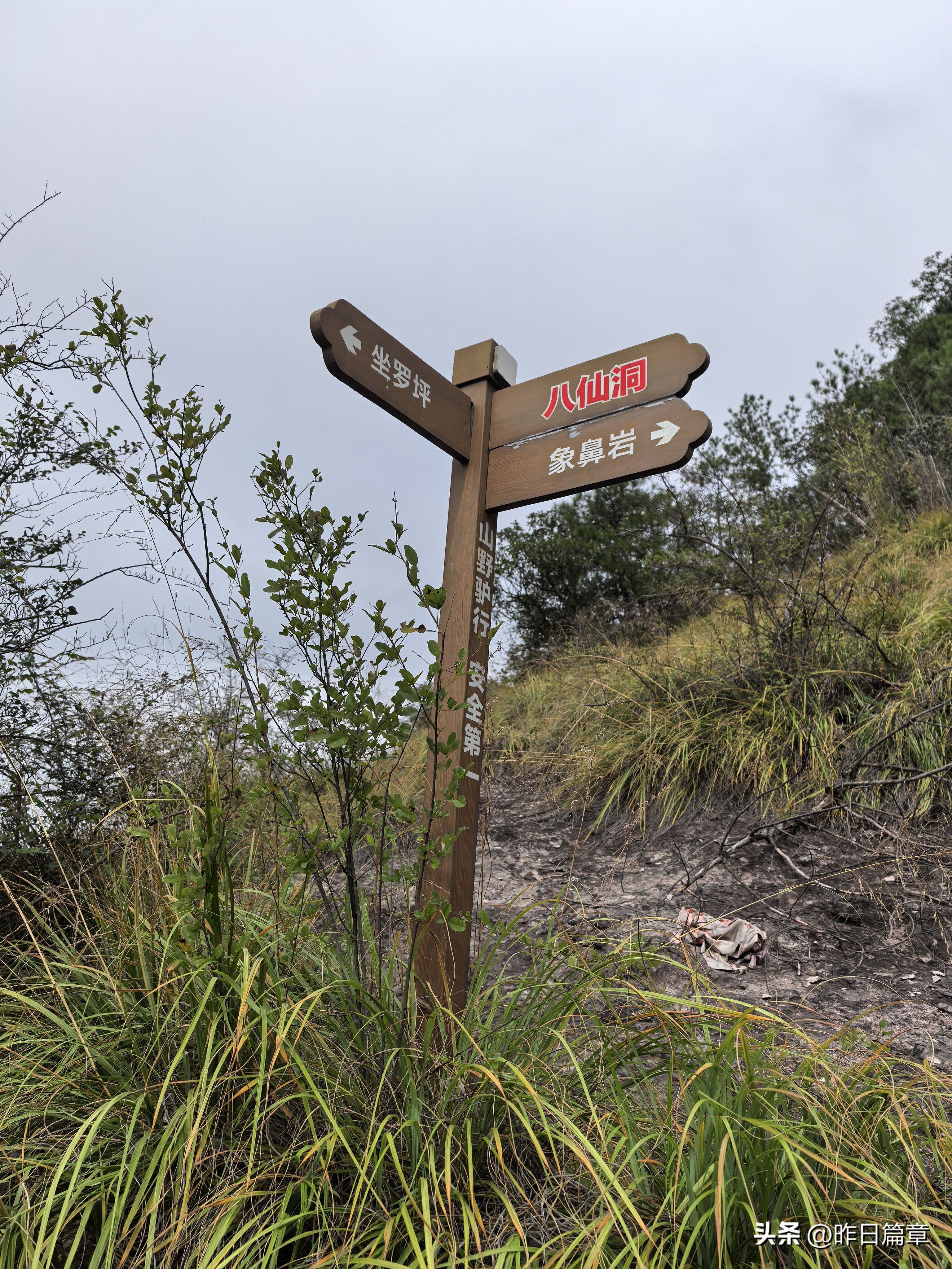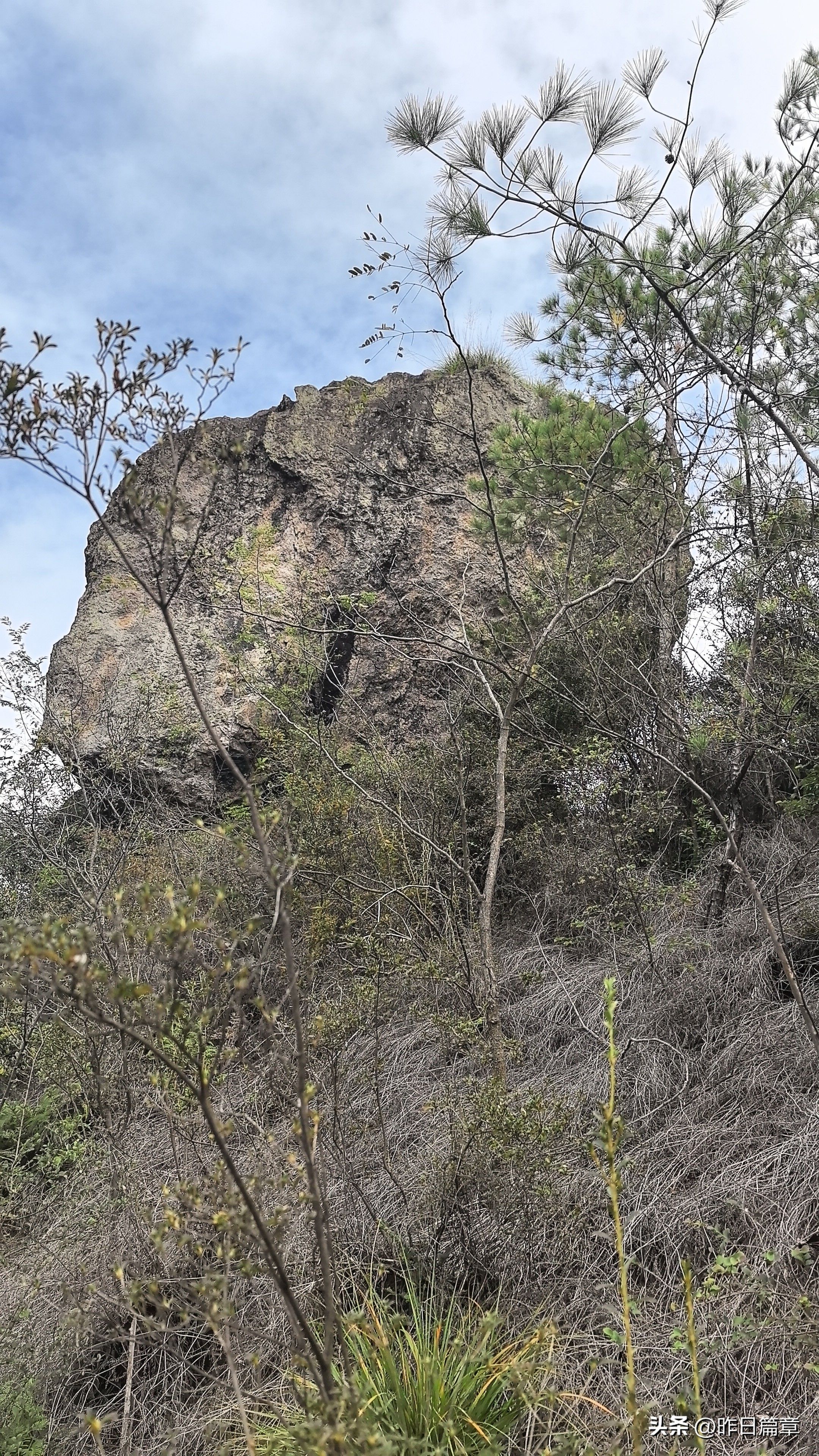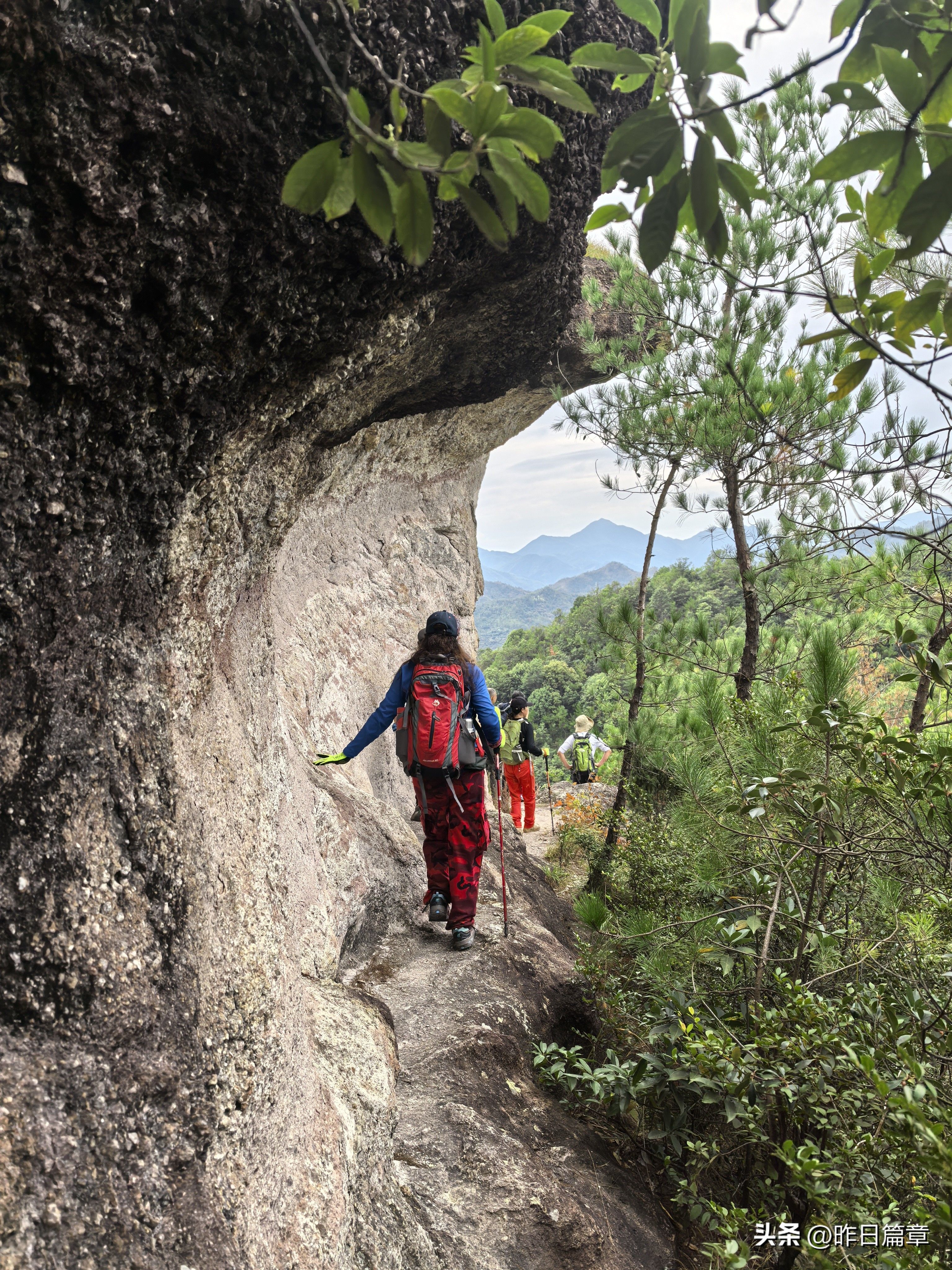 大客车停平黄公路缙云综合治超点附近公路边。我们沿公路北面去朱弄水库方向的水泥路徒步220米左右,右面有上山的环浙步道登山路标,朝朱弄水库和洪岭脚方向走,穿过山脚一片茂密的树林,就是岩板山。一个巨大石柱(当地人称其为千斤岩)孤悬在岩板上。拍照打卡后继续攀上小山顶,环顾四周,大都是岩板裸露,植被稀疏,脚下是风化的碎石。左边谷底是狭长的朱弄水库。远眺左对面山脊背有二座石峰蛮好看,一座像一丛蔴菇,另一座不知像啥。我用华为P70pro的远摄镜头拍下一看,像蔴菇的那座石峰也像骆驼,当地人标为驼峰,另一座不知像啥的拍下一看,像乌龟,看得清乌龟头(当地人标称龟峰)。继续沿山脊环浙步道徒步,前面的悬崖峭壁挡住去路。得益于全民健身运动,政府在不易攀登的地方固定了铁链。大家依领队的吩咐,强弱间个攀登到顶,在峰顶向北远眺,那座又高又尖的山峰就是我和老张曾经登顶的新屋村后山,向来时方向俯瞰,山脊驴道清晰可见,朱弄水库一览无余。广告牌标示:缙云驴道,环朱弄水库山脊线。我们从顶峰下来沿山脊走一点路,有个路牌,标示此处地名“米桶倾”,我不知为什么起这个名?路牌一面指示,千斤岩方向,一面指向龟峰,一面指向屏风岩,屏风岩三字下面括号标注玉岭头八仙洞环脊线。由此看来,环朱弄水库山脊线,只能欣赏千斤岩、米桶倾、龟峰、骆驼峰四景。领队将我们带向屏风岩方向,再走玉岭头八仙洞环脊线。玉岭头八仙洞环脊线有哪些景点呢?