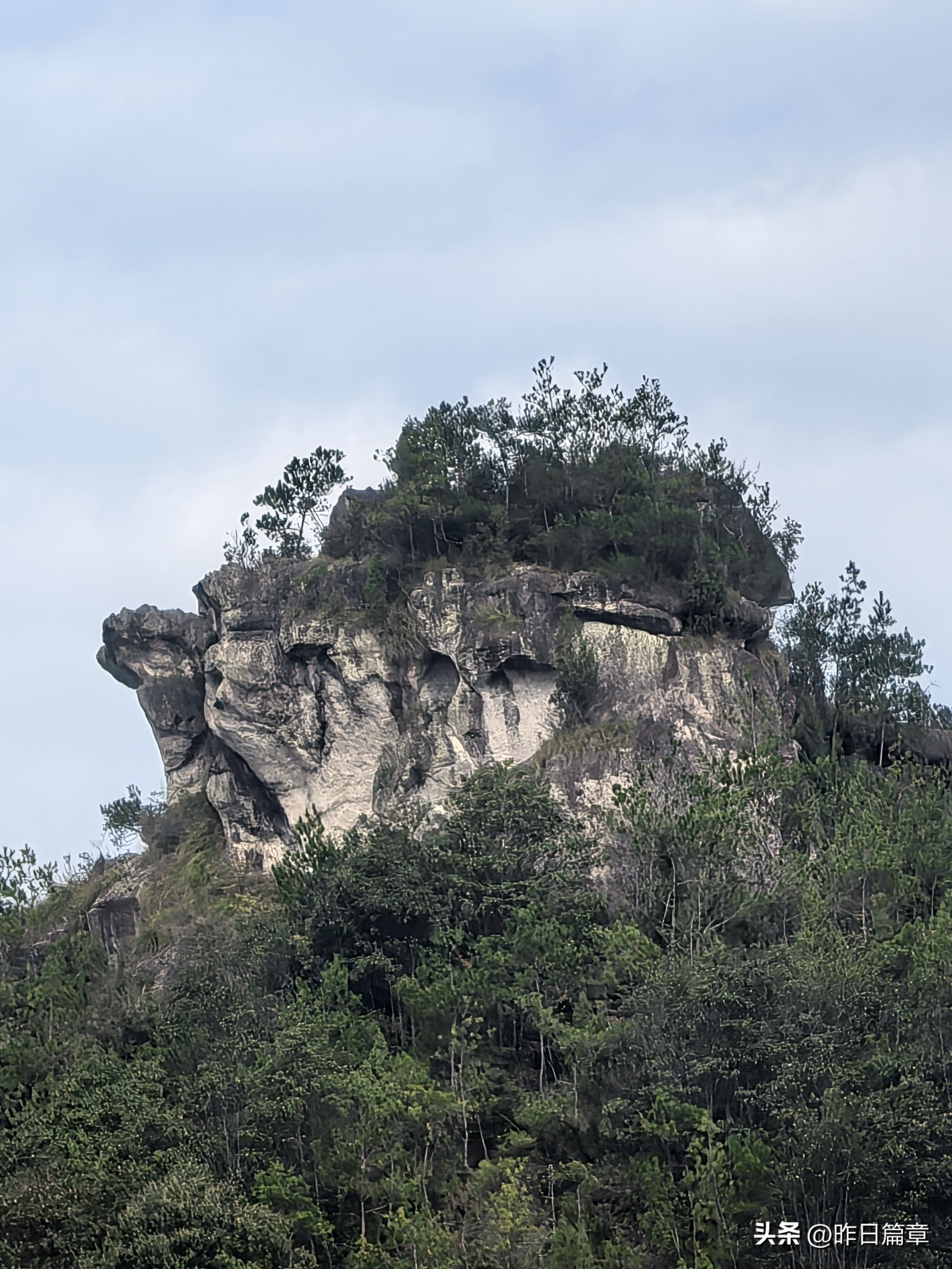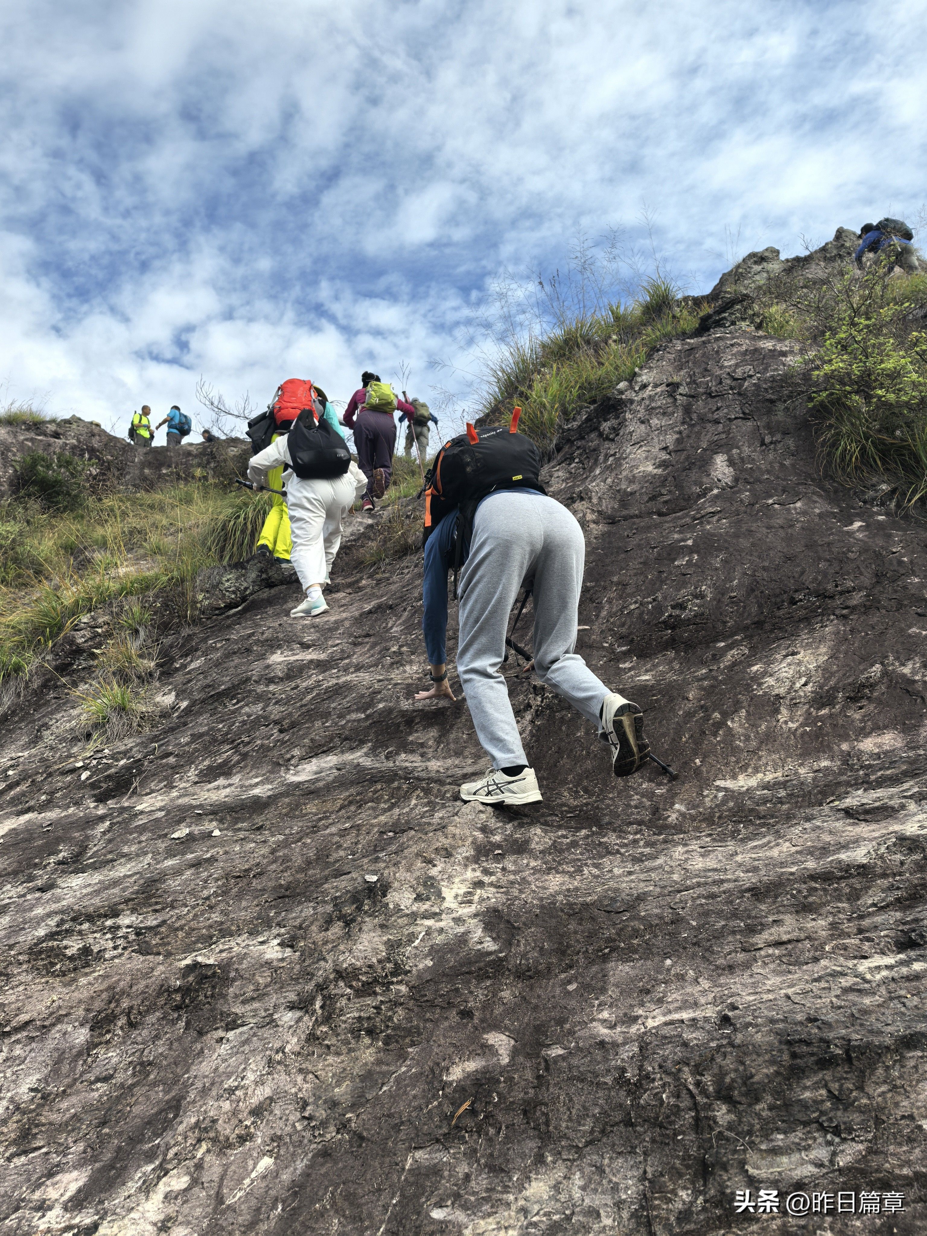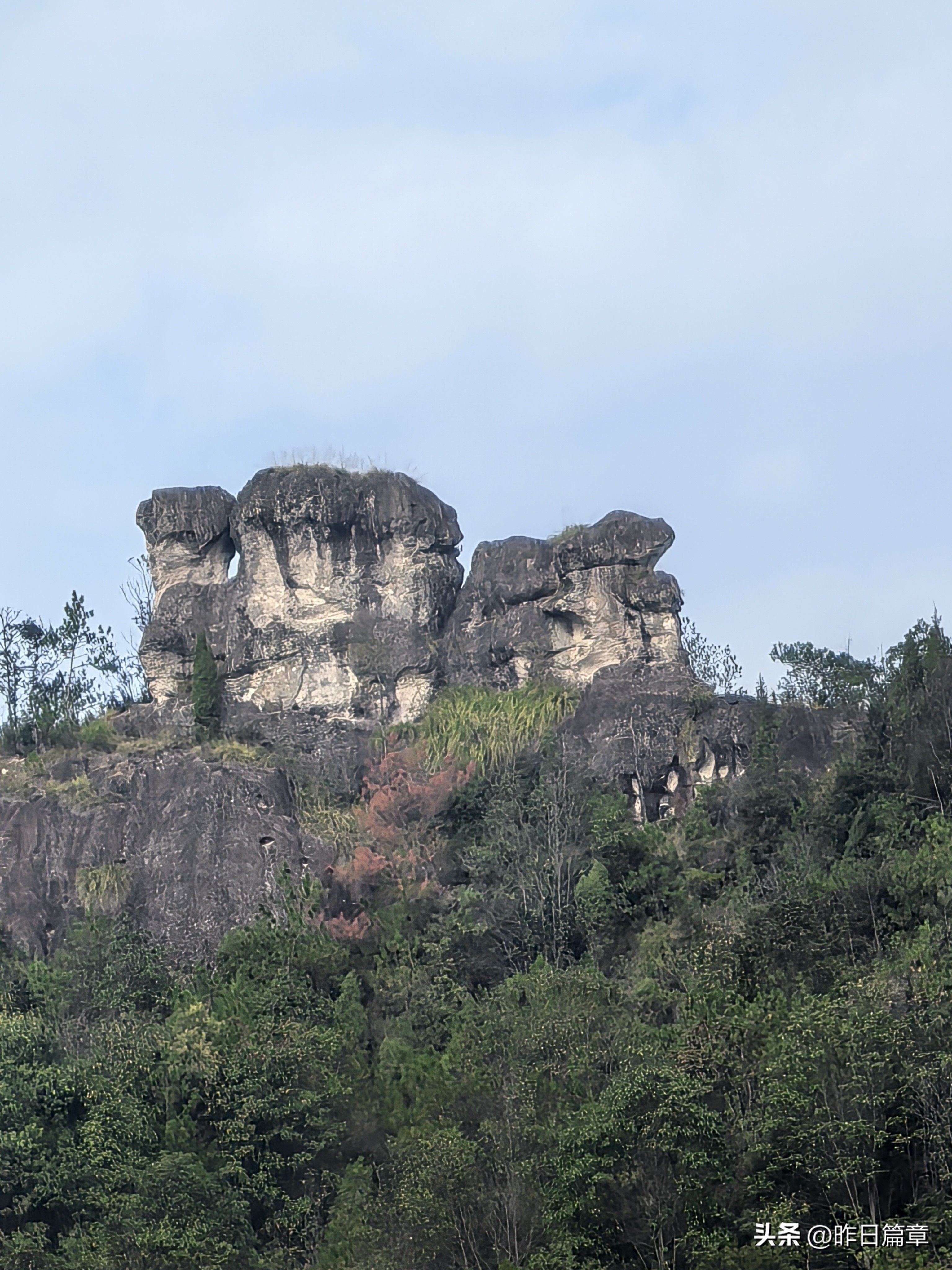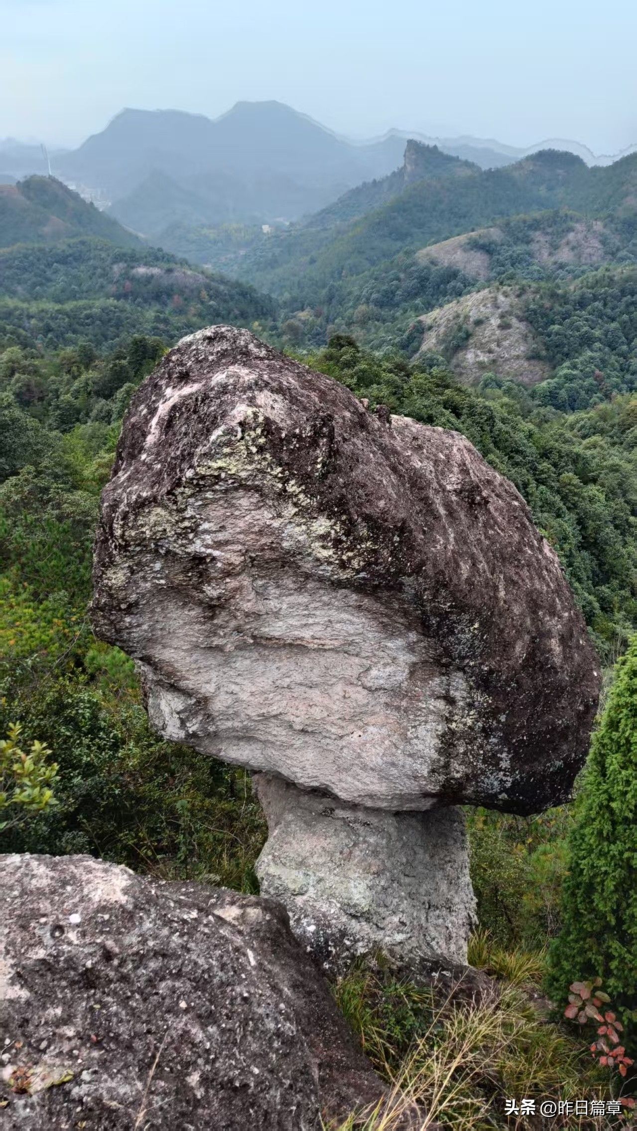 大客车停平黄公路缙云综合治超点附近公路边。我们沿公路北面去朱弄水库方向的水泥路徒步220米左右,右面有上山的环浙步道登山路标,朝朱弄水库和洪岭脚方向走,穿过山脚一片茂密的树林,就是岩板山。一个巨大石柱(当地人称其为千斤岩)孤悬在岩板上。拍照打卡后继续攀上小山顶,环顾四周,大都是岩板裸露,植被稀疏,脚下是风化的碎石。左边谷底是狭长的朱弄水库。远眺左对面山脊背有二座石峰蛮好看,一座像一丛蔴菇,另一座不知像啥。我用华为P70pro的远摄镜头拍下一看,像蔴菇的那座石峰也像骆驼,当地人标为驼峰,另一座不知像啥的拍下一看,像乌龟,看得清乌龟头(当地人标称龟峰)。继续沿山脊环浙步道徒步,前面的悬崖峭壁挡住去路。得益于全民健身运动,政府在不易攀登的地方固定了铁链。大家依领队的吩咐,强弱间个攀登到顶,在峰顶向北远眺,那座又高又尖的山峰就是我和老张曾经登顶的新屋村后山,向来时方向俯瞰,山脊驴道清晰可见,朱弄水库一览无余。广告牌标示:缙云驴道,环朱弄水库山脊线。我们从顶峰下来沿山脊走一点路,有个路牌,标示此处地名“米桶倾”,我不知为什么起这个名?路牌一面指示,千斤岩方向,一面指向龟峰,一面指向屏风岩,屏风岩三字下面括号标注玉岭头八仙洞环脊线。由此看来,环朱弄水库山脊线,只能欣赏千斤岩、米桶倾、龟峰、骆驼峰四景。领队将我们带向屏风岩方向,再走玉岭头八仙洞环脊线。玉岭头八仙洞环脊线有哪些景点呢?