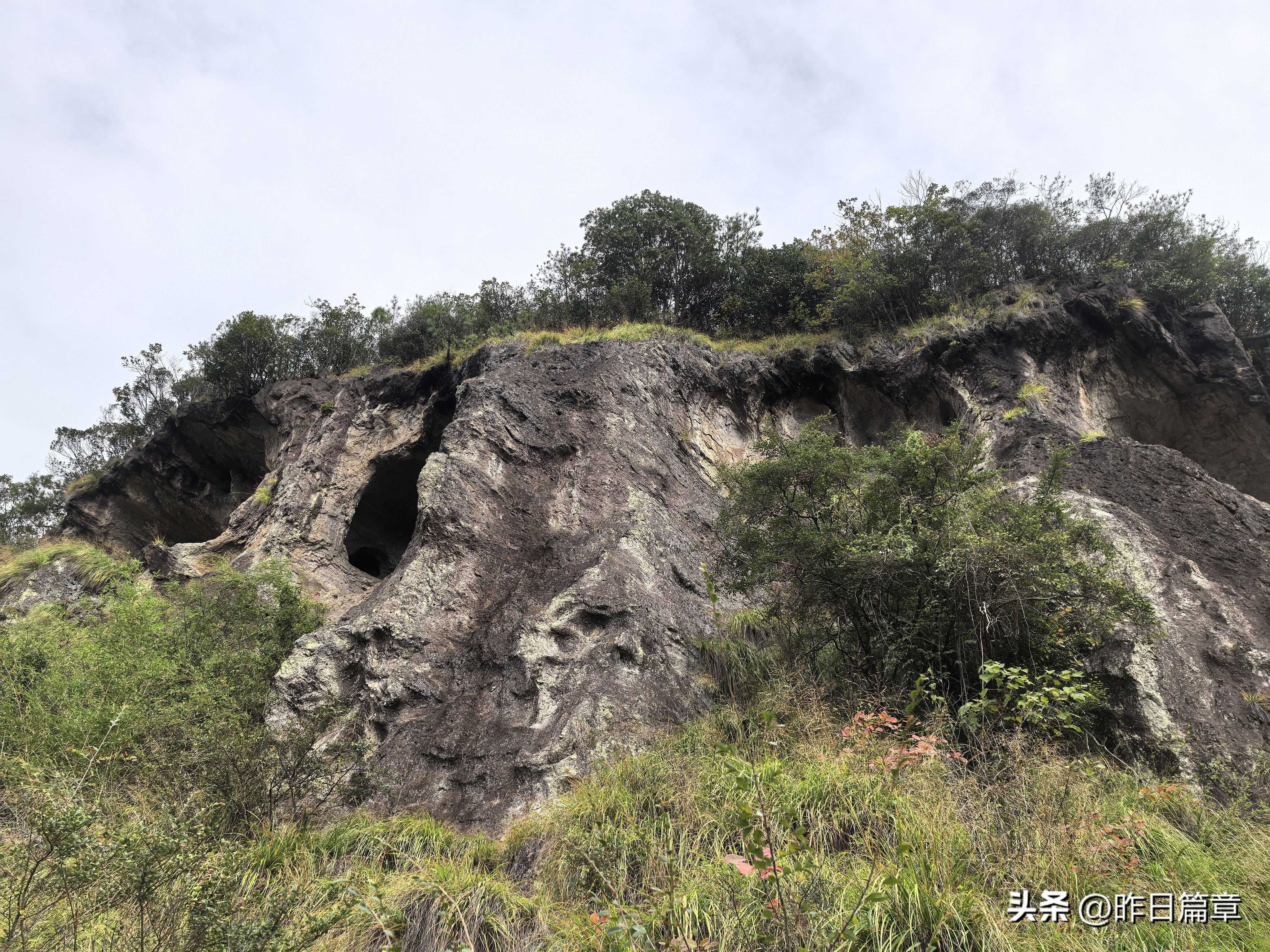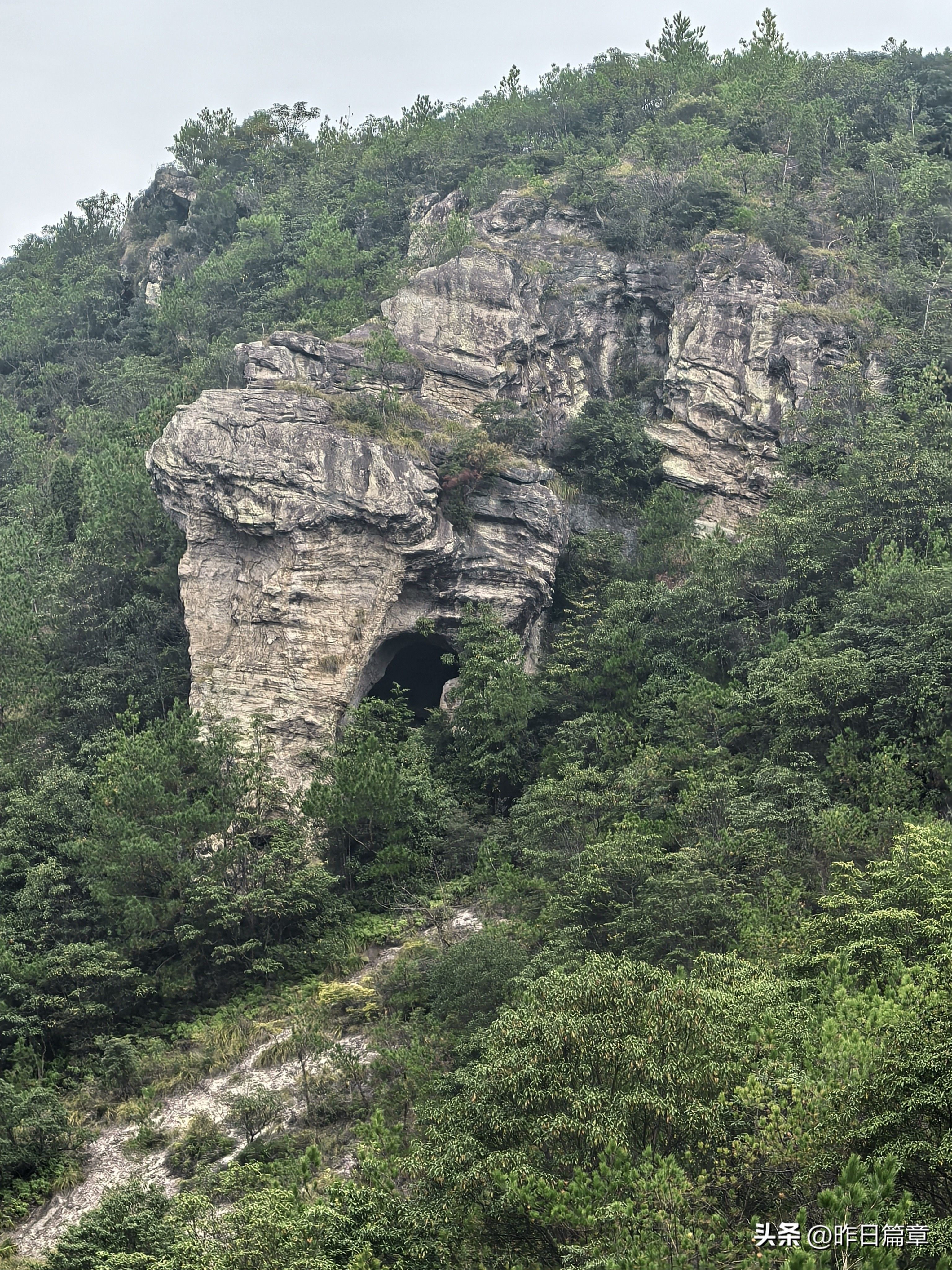 到达洪岭脚村已是中午,大家就在村里吃干粮。饭后继续往村内上山的路徒步,走玉岭头八仙洞山脊环线。到岭头看高德地图,附近标注的是天堂山,也是缙云仙都风景区的边缘。翻过岭头,山脚那被誉为天下第一笋的鼎湖峰、游客索道,清晰可见。继续沿山脊下行,有多处较佳的摄影点可拍鼎湖峰。在山脊有路标标示此处是八仙洞,继续沿山脊向下,去坐罗坪,横向去象鼻岩。我们转向象鼻岩,没走几步有个八仙洞庙,从其门口曾贴八仙过海显神通,五福临门聚人气的对联看,应该祭祀吕洞宾、铁拐李等八仙。八仙洞庙处在悬崖下,峭壁上有多个洞穴。沿横向路走好久,都没看到象鼻岩,快到龟峰时回头看八仙洞方向,象鼻岩的象鼻清晰可见。走到这里,我们知道走玉岭头八仙洞山脊线,还可欣赏天下第一笋,八仙洞,象鼻岩。继续沿山脊走到龟峰,龟甲撑开像屋檐,大家从龟甲下穿过。伸手可及的龟峰并不像龟,正像刚才从象鼻岩下经过发现不了象鼻岩一样,在米桶倾那边山脊看龟峰则像龟,但是近看龟峰有个部位很像龟头,有眼睛、有嘴巴。离开龟峰,继续沿山脊走到了骆驼峰。孤悬的一丛石群立在山脊上,高低不一,还有穿洞,像骆驼背和昂起的骆驼头,大家拍照打卡后,继续沿山脊走,还有一处未名命的岩石,有点像匍匐在地的鳄鱼。从骆驼岩下来的路标点是山脊叉路口,向路标指示终极点方向走,到朱弄水库边上,有两支山脊,都挂有驴条,不知走哪边,大家都停下休息等领队。这两处山脊,既陡又秃,只有岩板和风化的碎石,没树。大家席地而坐,环顾四周。轻描突然喊:桶样,桶样,会拍来否?我也看米桶倾方向,只见刚才抓铁链攀登的上方山峰有个周边倾斜的圆形凹槽,象个圆桶,虽然初冬的下午,光线暗淡,仍能见到,随即用长焦镜头拍下。这应该就是米桶倾名字的出处。