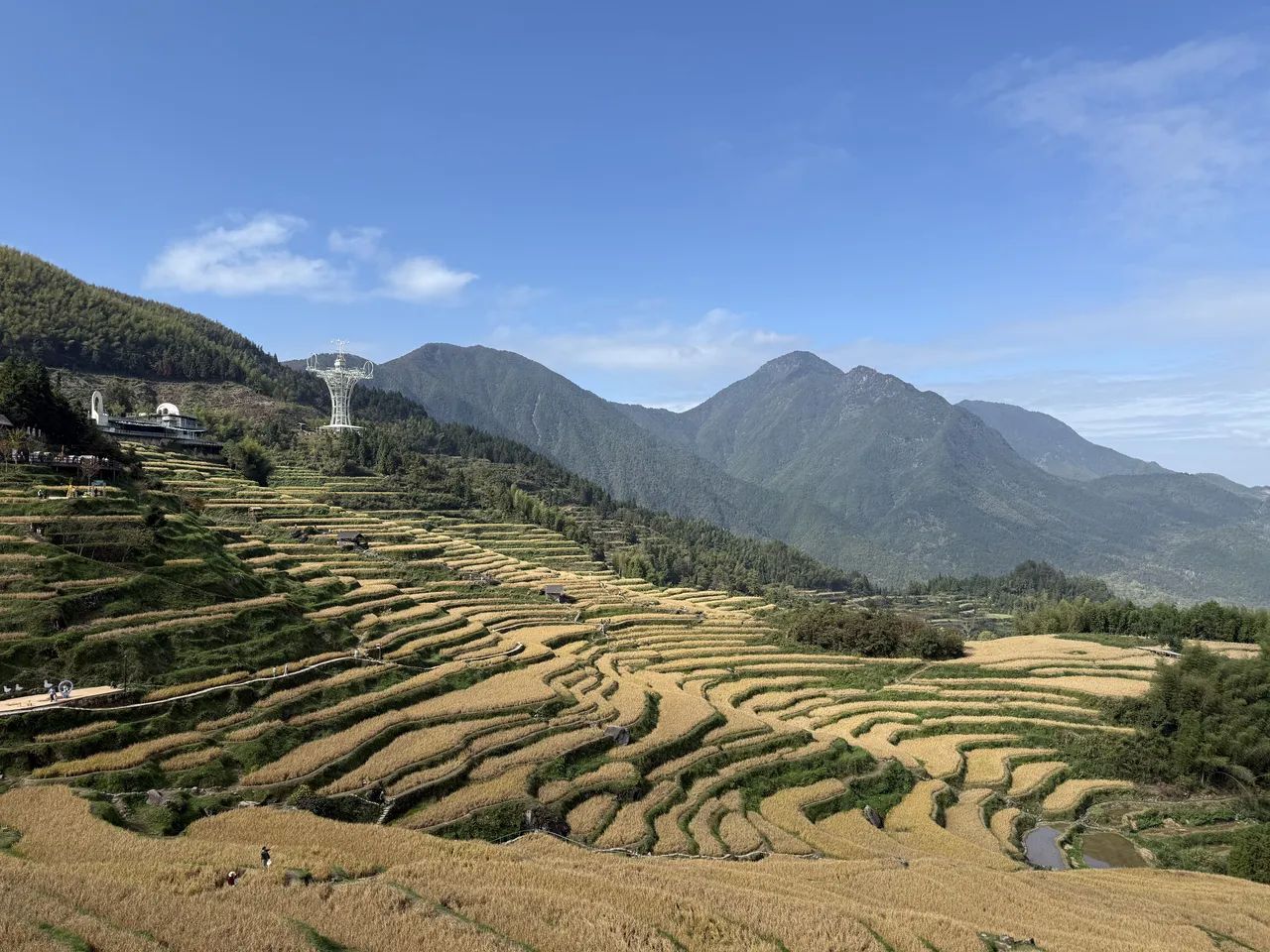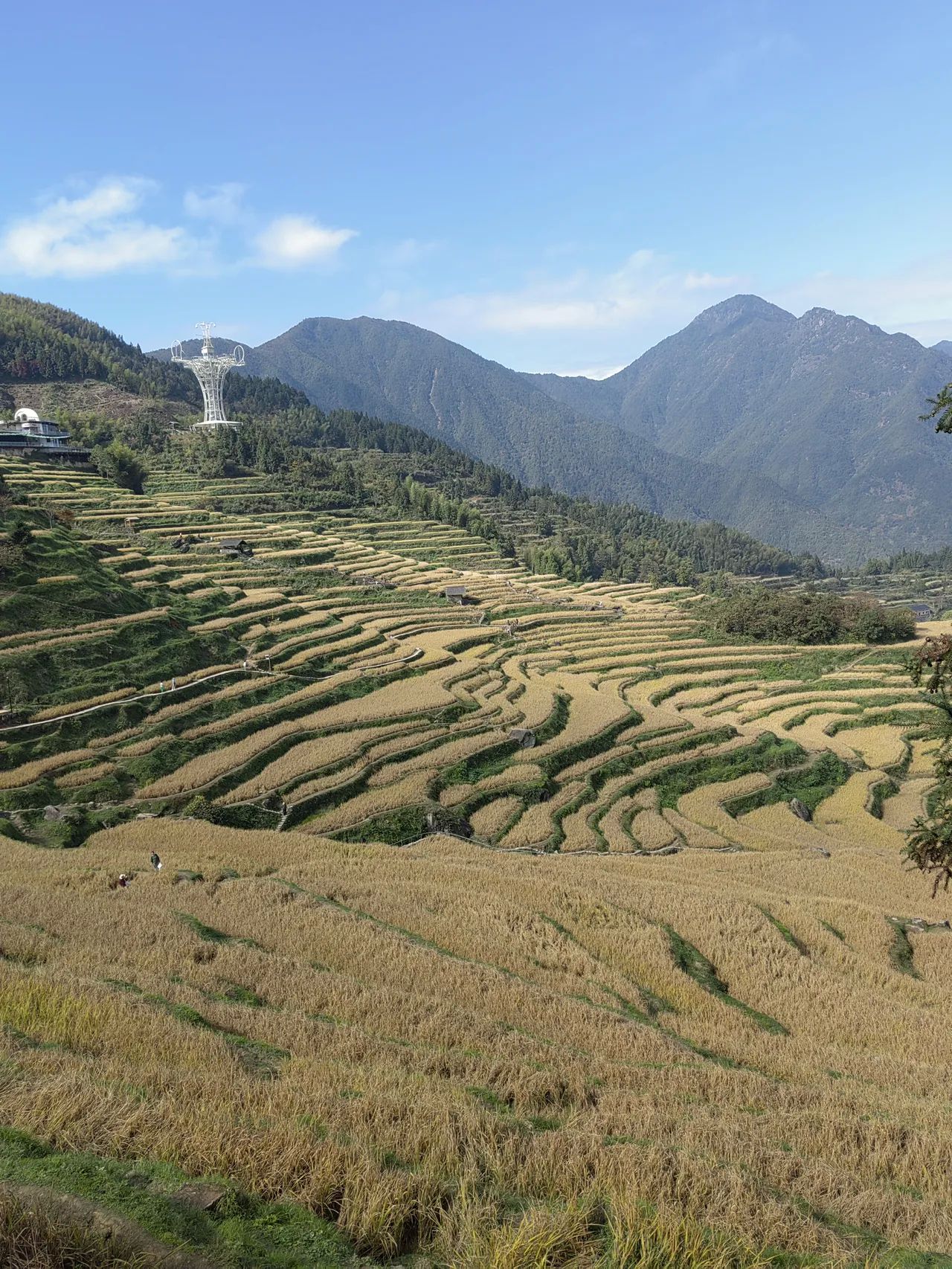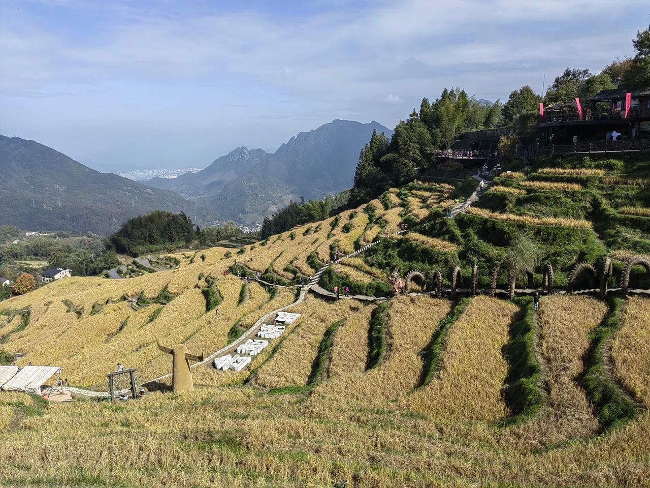 一直想去看看丽水的自然风景,几年前自驾只去过缙云仙都,云和梯田和古堰画乡,松阳老街和杨家堂村都想去看看。有机会和孩子一起,对我们来说真的是很轻松。高铁下来,就享受到了包车服务,司机很负责,也很守时。每个景点都会说清楚,不走回头路。也可以说是司机加导游了。走一个村,需走三座大山。司机很辛苦的。如真的是自驾游,路不熟,且山路多。出门旅游,玩的开心是第一。住的民宿也是遇到了很热心的老板。帮着把我们的箱子一个台阶一个台阶的往山上扛。早餐时和老板的母亲聊天,老俩口和儿子经营着民宿,儿媳在镇上上班,孙子在镇上读小学。儿子既要接待民宿的客人,还要按时接送孩子上下学,很是辛苦的。建一座有七八间房的民宿,当时花费了几百万,因为在山上,人工费很贵。清晨散步时,看到正在建的民宿,就是挑着黄沙一步一步往山上走,也许他们已经习惯,但不论怎样,都是为了生活。从高铁站~缙云仙都~书房,晚餐后散步在瓯江边。第二天的松阳老街~杨家堂~松庄村~陈家铺村,每一个景点,都是人间仙境。第三天的云和梯田更是美好,天气不错,蓝天白云,金灿灿的梯田尽收眼底。古堰画乡虽没有想象中的好,就当是回家前稍息停留的散步好地方。晚餐后司机送至丽水站。行程很是满意。丽水~好山好水好风光。