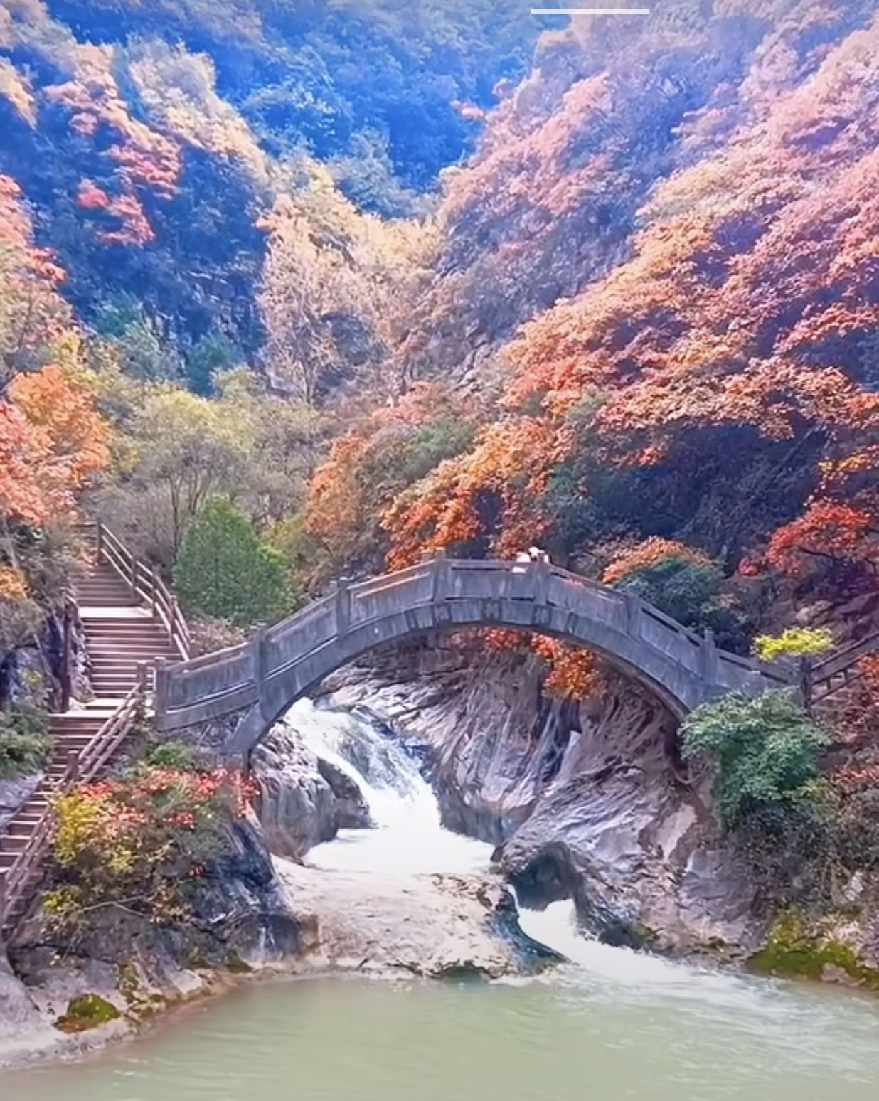 秋日的西狭,最惊艳的莫过于漫山红叶。经秋霜点染,峡谷两岸的林木褪去翠绿,换上赤橙黄紫的盛装。近观,枫叶似火、黄栌如霞,叶片在阳光下泛着剔透光泽;远眺,层林叠叠如打翻的调色盘,与蓝天碧水相映,成就“满山遍野映山红”的壮阔画卷。溪水潺潺穿峡而过,清冽的水流倒映着两岸红叶,动静之间,满是诗意,引得游人驻足拍照,沉醉于这份浓烈而纯粹的秋意。