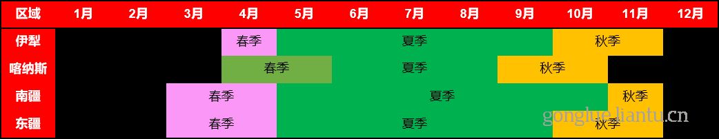 1.北疆:伊犁(阿勒泰+塔城+伊犁),昌吉,克拉玛依,博乐