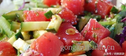 Poki这道菜是用新鲜的金枪鱼和鳄梨做成的,是典型的夏威夷特色食品。把金枪鱼用酱油、芥末和料酒、麻油腌渍30分钟,再把鳄梨切块与金枪鱼块搅拌在一起,加上海苔便做成了。