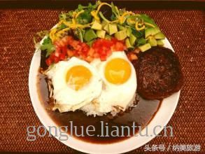 带有美、日特色的Loco Moco,是传统的夏威夷美食,它是将汉堡肉饼和鸡蛋覆盖在米饭上,再浇上卤汁而成。全岛各处餐馆菜单上,都一定有这一道菜。