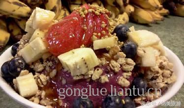 Acai Bowl是夏威夷火热流行的甜品,在当地的各个美食摊档或者咖啡屋等都可以找得到。Acai Bowl里除了Acai、香蕉、草莓水果外,还添加了各宗燕麦,豆乳等,是一款美味有健康的甜品,备受女士们的青睐。