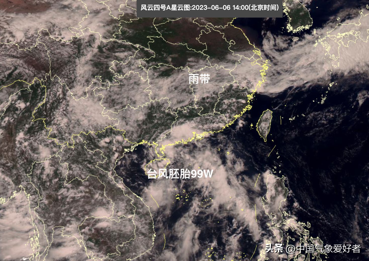 6月6日下午,从风云四号高清可见光卫星云图上可见,今天南海上生成的台风胚胎99W已经来到了华南沿海附近。虽然台风胚胎99W很弱,并未能发展成为新台风,但它已经拉动水汽在华南沿海上岸,今天广东海南多地暴雨倾盆。同时,也可以看到,在长江流域,一条雨带从云贵高原延伸到长江口附近,在这条雨带下,昨天到今天不少地方也同样暴雨倾盆。