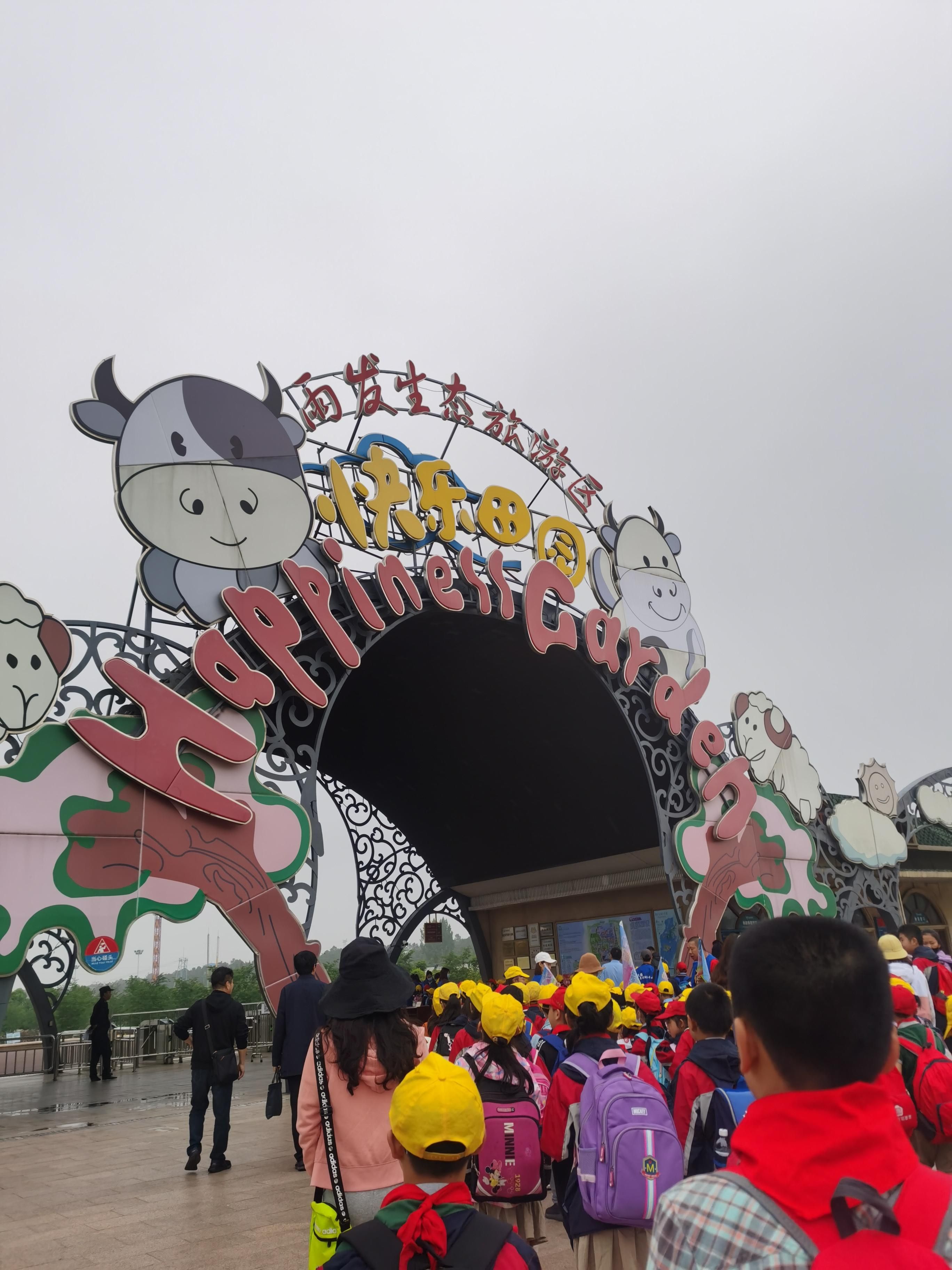今天学校组织同学们去雨发生态园,一路上我千叮咛晚叮嘱让他们不要过于兴奋,孩子们在车上竭力保持安静。我隐约感受到我的视线一旦离开他们,他们的话语就会燃爆车厢。终于到了目的地,同学们像放飞的鸽子跟着导游在入口处等候。售票处设计的满是喜感半圆形架子上两只小牛萌萌地看着游客,“快乐田园”几个字也如汉字王国的精灵在拍手欢迎游客的到来。
