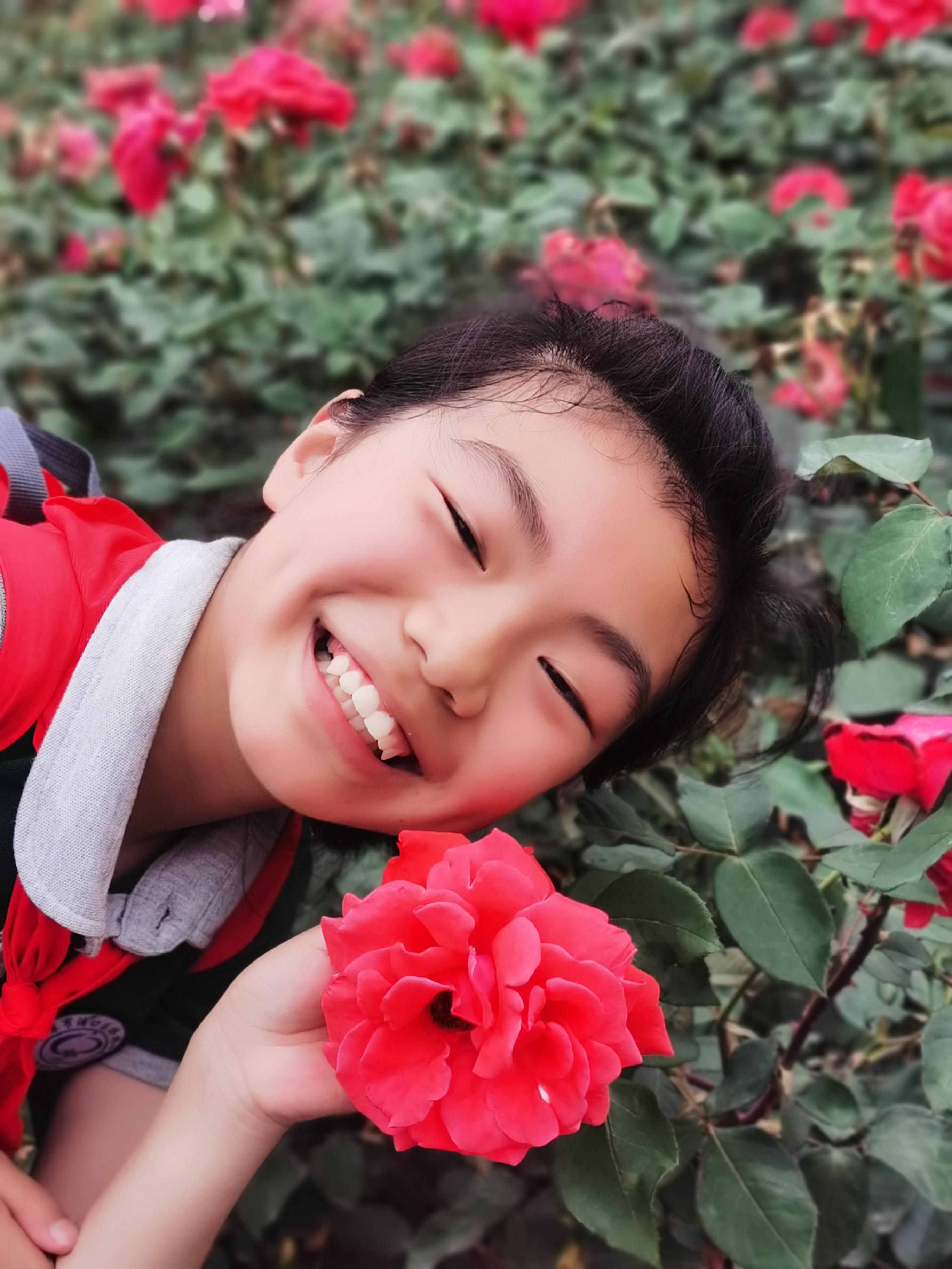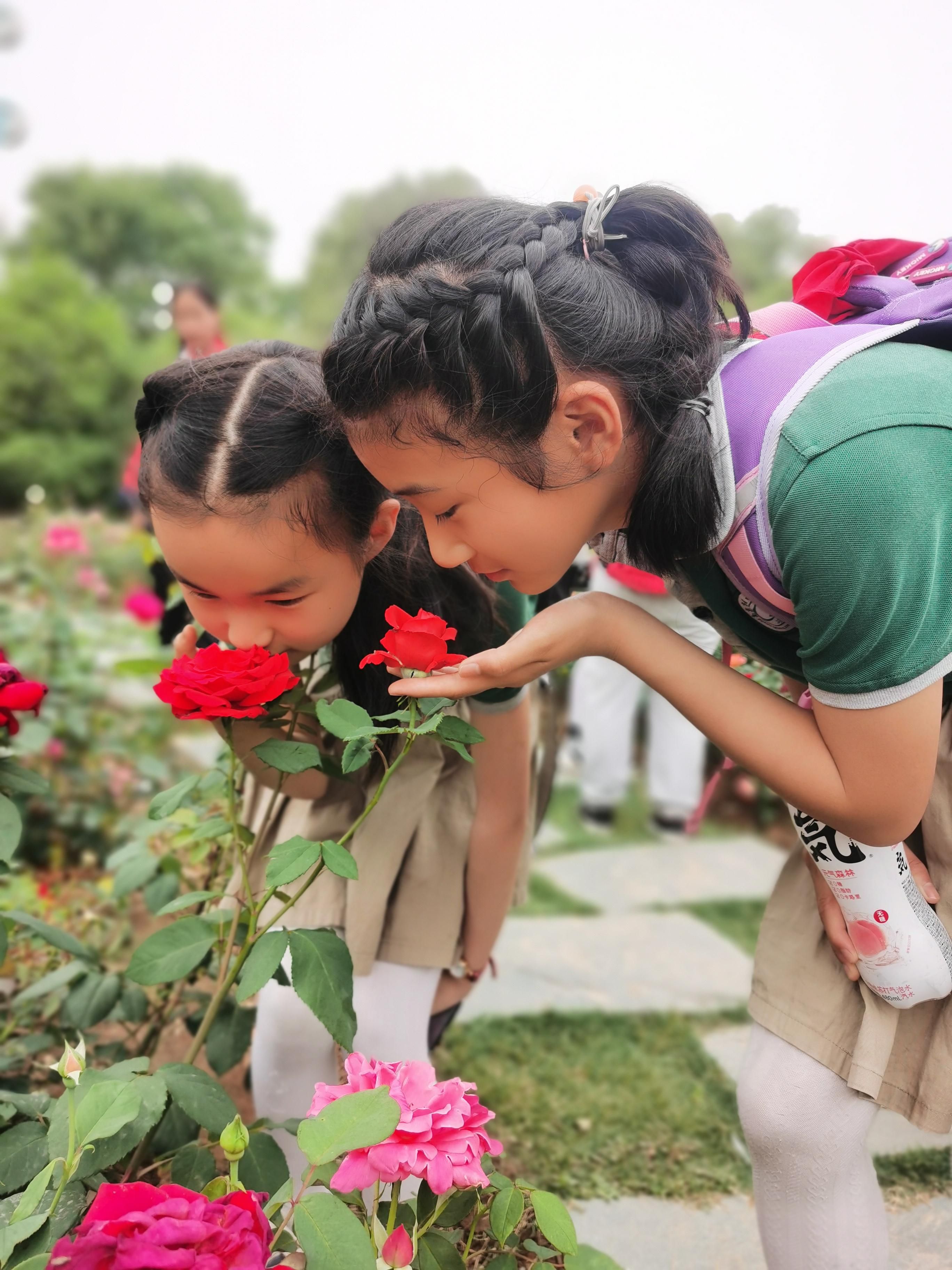 刚走进去天地无限辽阔,眼前一架硕大无朋的摩天轮高高地矗立着,显得格外壮观。放眼望去到处都是绿意,清晨刚下些毛毛雨,空气里弥漫着花草和春雨的香气息,使人神清气爽。我们沿着微湿的花砖小路行走着,路两旁大片大片的月季花竞相开放,见我们所有人都对它们赞叹不已,花儿涨红了脸般在微风的吹拂下摇曳着婀娜的身姿,仿佛要在这一刻释放它们所有的生命激情。面对这一片花海我彻底醉了,我示意孩子们停下脚步和花儿留影纪念,并让他们自由组合摆好pose。月季花海一眼望不到边,这一片是艳丽的红,那一片是纯净的白,还有粉嫩的黄……五颜六色美不胜收。“老师这朵月季怎么比我的脸还大,我从没见过这么大的月季。”“老师,这一朵花的花瓣怎么有好几种颜色?”“老师,这六朵月季挤在一起开放,都快挤破头了。”……孩子们你一言我一语沉浸在花的世界里,我的相机里留下了一张张比花儿还美的笑靥。在开花的季节花儿使尽浑身解数绽放短暂的美丽,也忙坏了辛勤的蜜蜂它们钻进花蕊里吮吸着花蜜,兴许是这里的花蜜格外甜的缘故,蜜蜂几乎都是躺在花蕊里享用花蜜,它们不停地抖动着肥胖的身躯似乎已经被花蜜醺醉了,就那样一边侧躺着一边不停地吮吸着,我真担心花蜜会撑坏了它们的肚皮。我多想这样静静地守护着花丛,感受着花的美丽与芳香,倾听着花语,我差点忘了是带着学生来游玩的。