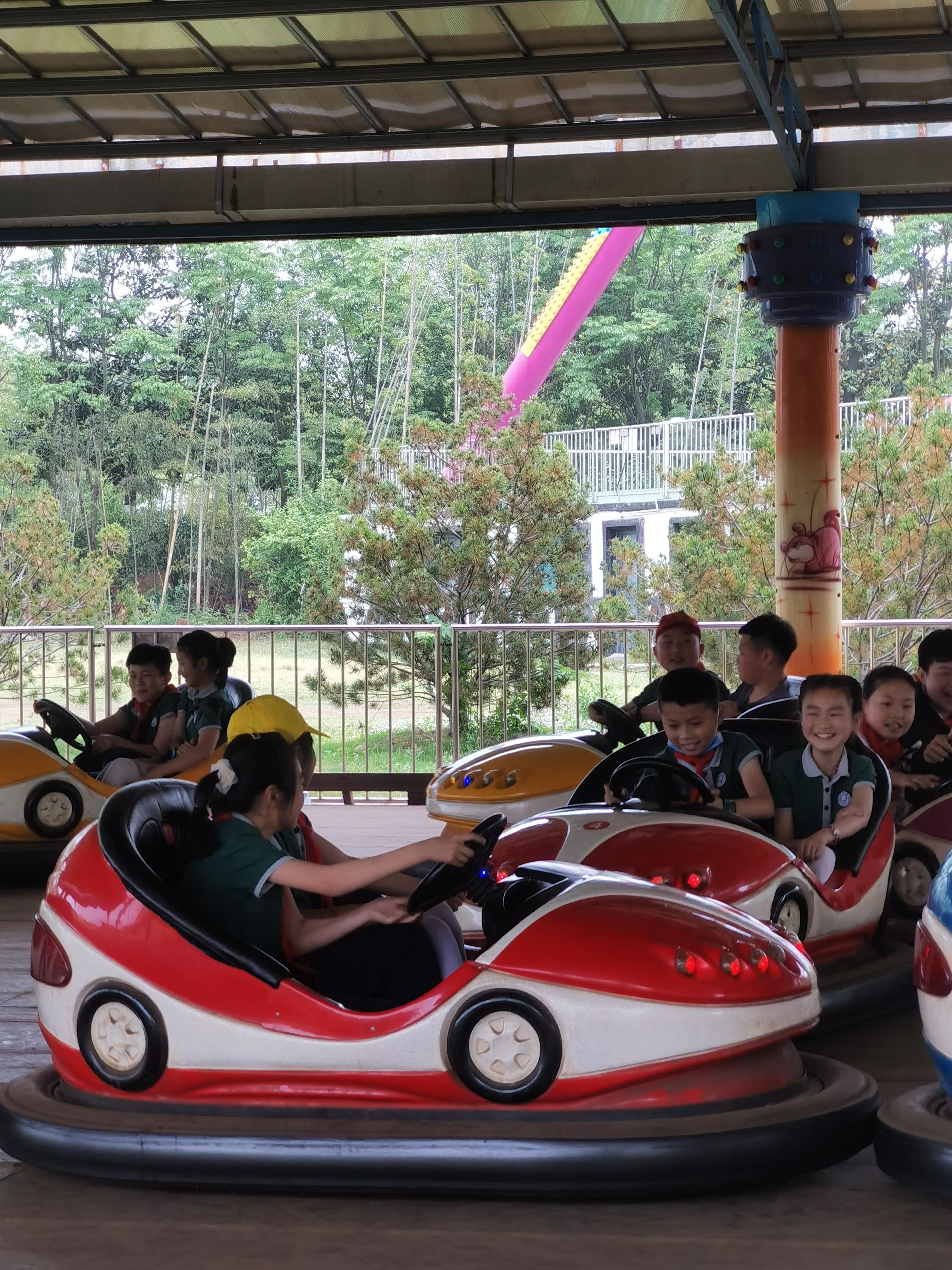 碰碰车也是孩子们喜爱的游乐项目,班里身高不足1.4米的得要老师陪着一起玩,这个项目我应该能hold住。我领着班里一个小机灵鬼坐上了车,此时我抛开了老师的身份和孩子们在一起撞呀、笑呀。我仿佛返老还童变回了孩子,孩子们也从没像现在这样敢无所顾忌地夹击围攻我。