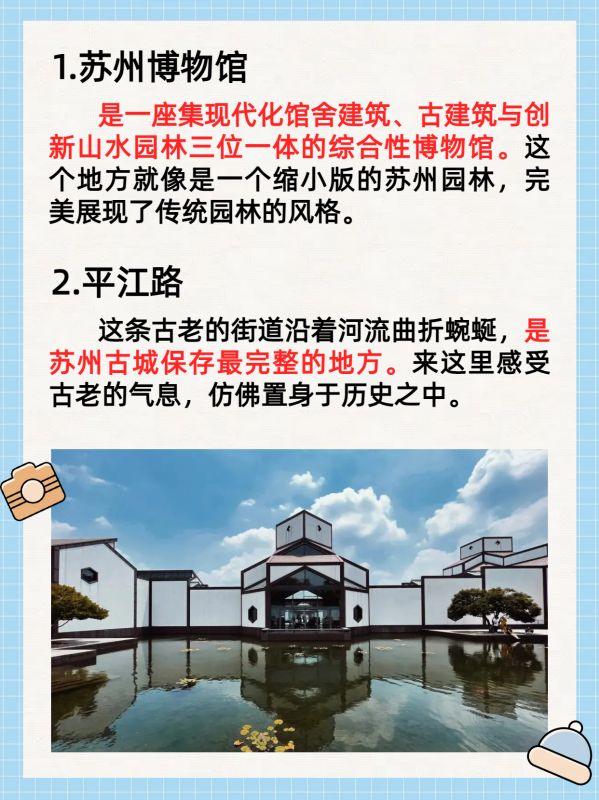 下午:苏州博物馆(2小时)、平江路(1小时)、金鸡湖(2小时)。