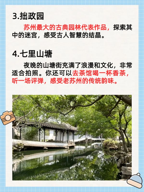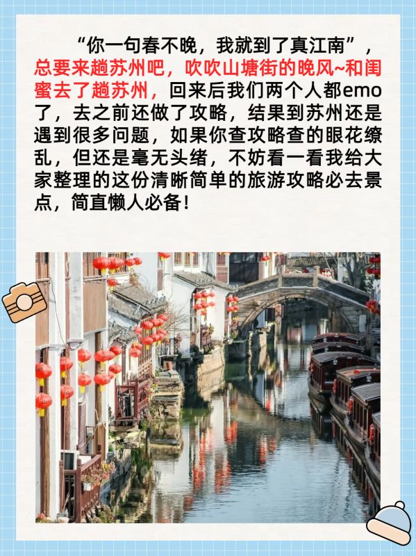 “你一句春不晚,我就到了真江南”,总要来趟苏州吧,吹吹山塘街的晚风~和闺蜜去了趟苏州,回来后我们两个人都emo了,去之前还做了攻略,结果到苏州还是遇到很多问题,如果你查攻略查的眼花缭乱,但还是毫无头绪,不妨看一看我给大家整理的这份清晰简单的旅游攻略必去景点,简直懒人必备!