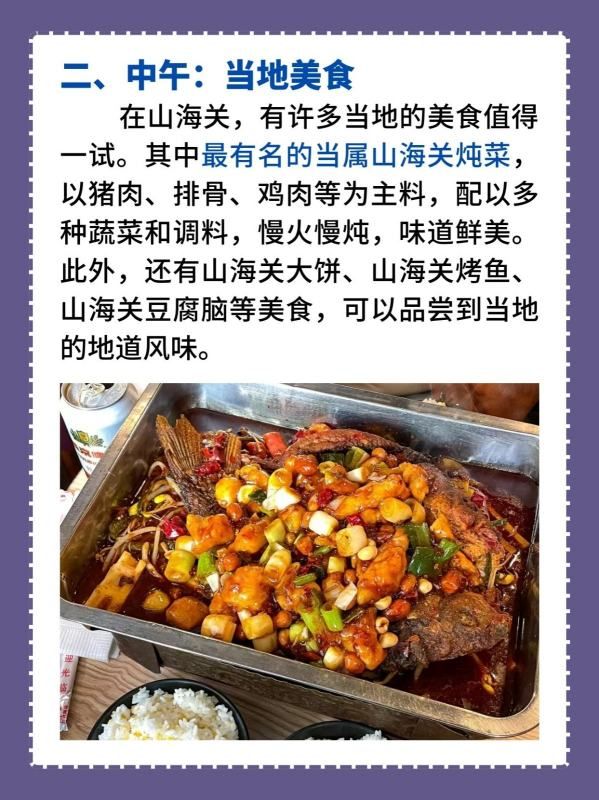 在山海关,有许多当地的美食值得一试。其中最有名的当属山海关炖菜,以猪肉、排骨、鸡肉等为主料,配以多种蔬菜和调料,慢火慢炖,味道鲜美。此外,还有山海关大饼、山海关烤鱼、山海关豆腐脑等美食,可以品尝到当地的地道风味。