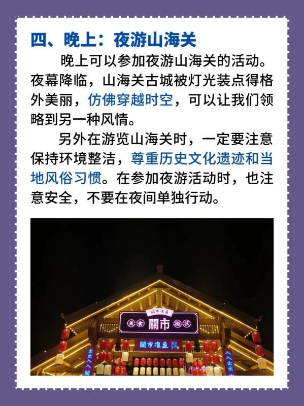 晚上可以参加夜游山海关的活动。夜幕降临,山海关古城被灯光装点得格外美丽,仿佛穿越时空,可以让我们领略到另一种风情。