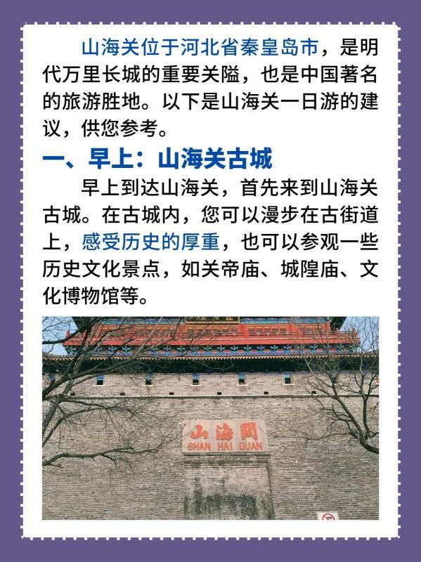 山海关位于河北省秦皇岛市,是明代万里长城的重要关隘,也是中国著名的旅游胜地。以下是山海关一日游的建议,供您参考。