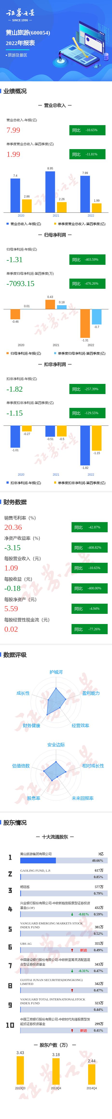 黄山旅游2022年报显示,公司主营收入8.0亿元,同比下降10.65%;归母净利润-1.32亿元,同比下降403.59%;扣非净利润-1.82亿元,同比下降257.39%;其中2022年第四季度,公司单季度主营收入2.0亿元,同比下降11.81%;单季度归母净利润-7093.16万元,同比下降476.26%;单季度扣非净利润-1.15亿元,同比下降129.55%;负债率17.64%,投资收益5613.21万元,财务费用-80.14万元,毛利率20.36%。