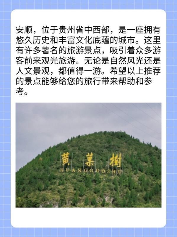 安顺,位于贵州省中西部,是一座拥有悠久历史和丰富文化底蕴的城市。这里有许多著名的旅游景点,吸引着众多游客前来观光旅游。无论是自然风光还是人文景观,都值得一游。希望以上推荐的景点能够给您的旅行带来帮助和参考。