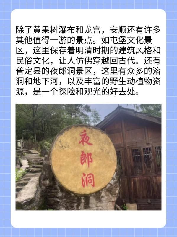 除了黄果树瀑布和龙宫,安顺还有许多其他值得一游的景点。如屯堡文化景区,这里保存着明清时期的建筑风格和民俗文化,让人仿佛穿越回古代。还有普定县的夜郎洞景区,这里有众多的溶洞和地下河,以及丰富的野生动植物资源,是一个探险和观光的好去处。