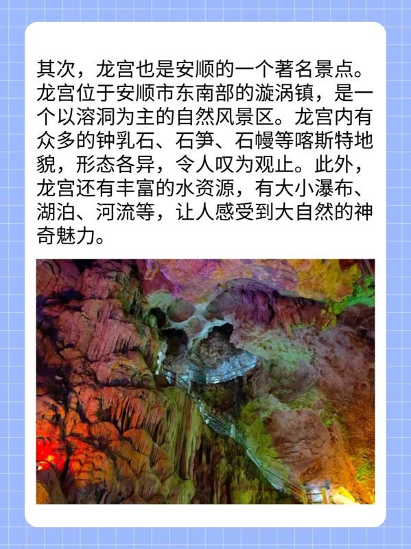 其次,龙宫也是安顺的一个著名景点。龙宫位于安顺市东南部的漩涡镇,是一个以溶洞为主的自然风景区。龙宫内有众多的钟乳石、石笋、石幔等喀斯特地貌,形态各异,令人叹为观止。此外,龙宫还有丰富的水资源,有大小瀑布、湖泊、河流等,让人感受到大自然的神奇魅力。