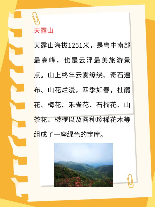 天露山海拔1251米,是粤中南部最高峰,也是云浮最美旅游景点。山上终年云雾缭绕、奇石遍布、山花烂漫,四季如春,杜鹃花、梅花、禾雀花、石榴花、山茶花、桫椤以及各种珍稀花木等组成了一座绿色的宝库。