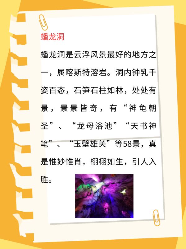 蟠龙洞是云浮风景最好的地方之一,属喀斯特溶岩。洞内钟乳千姿百态,石笋石柱如林,处处有景,景景皆奇,有“神龟朝圣”、“龙母浴池”“天书神笔”、“玉壁雄关”等58景,真是惟妙惟肖,栩栩如生,引人入胜。