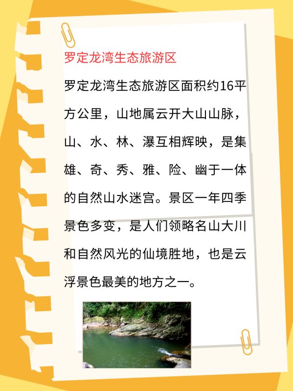 罗定龙湾生态旅游区面积约16平方公里,山地属云开大山山脉,山、水、林、瀑互相辉映,是集雄、奇、秀、雅、险、幽于一体的自然山水迷宫。景区一年四季景色多变,是人们领略名山大川和自然风光的仙境胜地,也是云浮景色最美的地方之一。