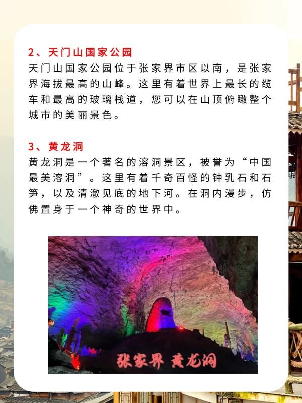 世界奇观之天门洞、惊险刺激之玻璃栈道、佛教中心之天门山寺、原始森林保护区之碧野瑶台等等都值得一览。
