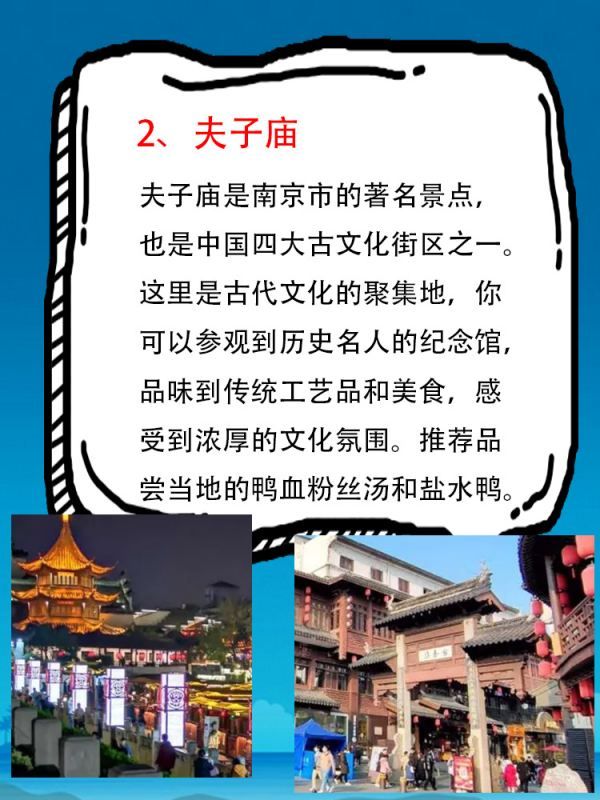 夫子庙是南京市的著名景点,也是中国四大古文化街区之一。这里是古代文化的聚集地,你可以参观到历史名人的纪念馆,品味到传统工艺品和美食,感受到浓厚的文化氛围。推荐品尝当地的鸭血粉丝汤和盐水鸭。