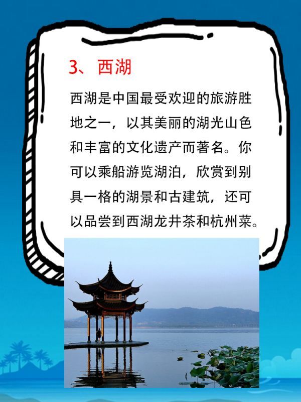 西湖是中国最受欢迎的旅游胜地之一,以其美丽的湖光山色和丰富的文化遗产而著名。你可以乘船游览湖泊,欣赏到别具一格的湖景和古建筑,还可以品尝到西湖龙井茶和杭州菜。
