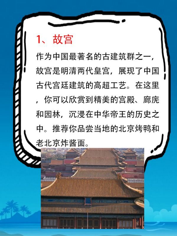 作为中国最著名的古建筑群之一,故宫是明清两代皇宫,展现了中国古代宫廷建筑的高超工艺。在这里,你可以欣赏到精美的宫殿、廊庑和园林,沉浸在中华帝王的历史之中。推荐你品尝当地的北京烤鸭和老北京炸酱面。
