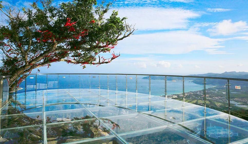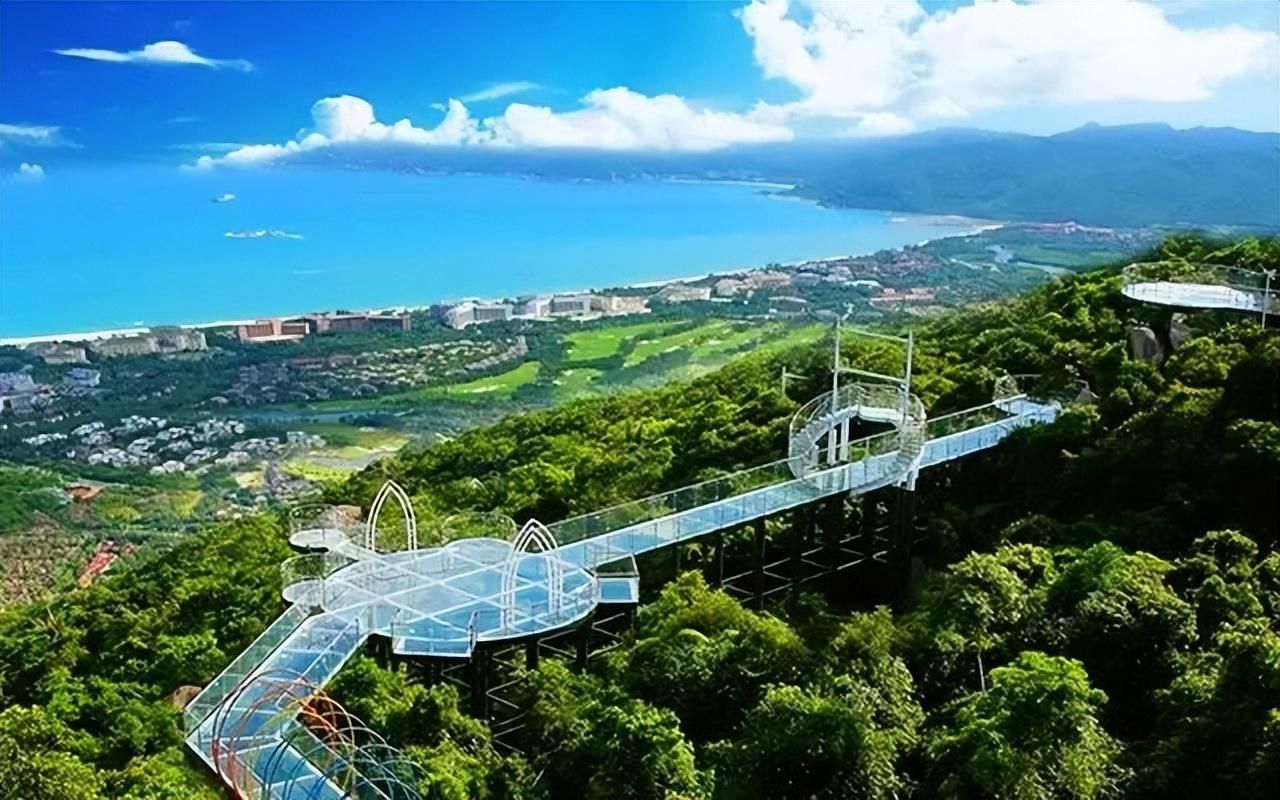 全海景玻璃栈桥位于亚龙湾热带天堂森林公园之巅,最高处海拔450米,为全海景玻璃栈桥。全长400米,最宽处10米,由130吨超金进口夹胶玻璃构成,包括凌空台、七彩天梯、彩莲观景台、彩虹之路、山盟海誓及心心相印等景点。上可仰观天高云淡,下可俯视逾百米深的雨林山谷,前可远瞰“天下第一海景”亚龙湾。