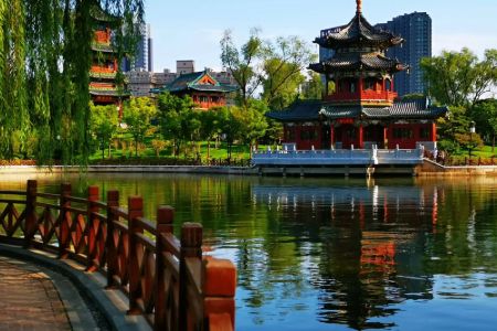 4、迎泽公园是太原风景最漂亮的地方之一,总面积666900平方米,分为北湖景区、中部景区、南部景区和南湖景区。