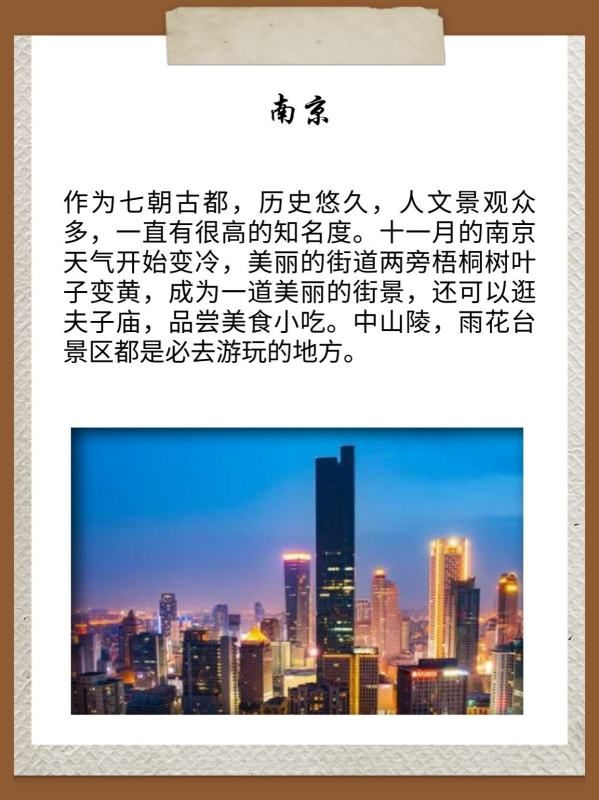 作为七朝古都,历史悠久,人文景观众多,一直有很高的知名度。十一月的南京天气开始变冷,美丽的街道两旁梧桐树叶子变黄,成为一道美丽的街景,还可以逛夫子庙,品尝美食小吃。中山陵,雨花台景区都是必去游玩的地方。