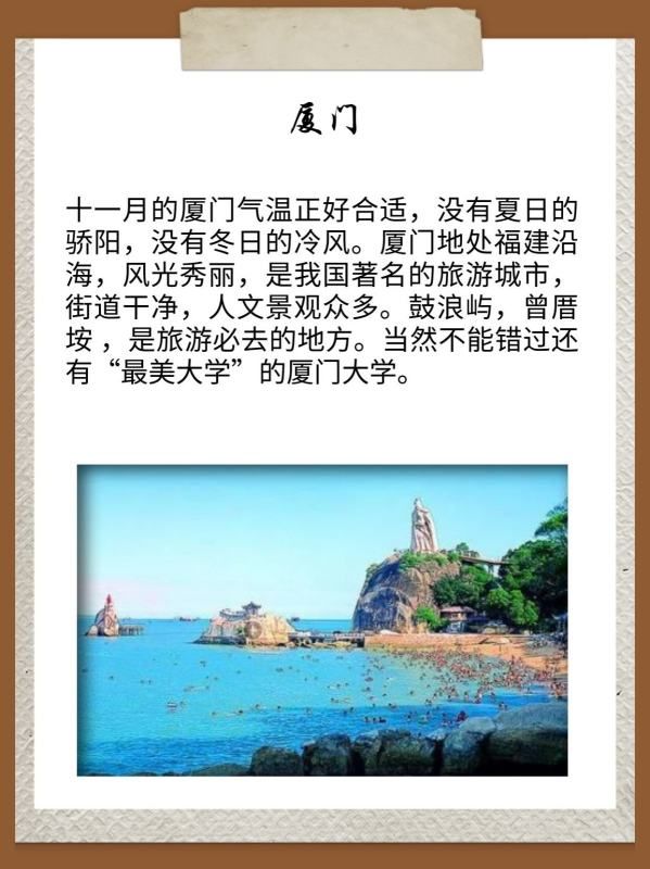 一、昆明;二、南京;三、深圳;四、厦门;五、杭州等。十一月的昆明气温二十四五度,穿衣短袖带一个外套就可以;南京可以逛夫子庙,品尝美食小吃;去深圳要带好防晒用品,特别是去海边游玩;厦门十一月气温正好合适,没有夏日的骄阳,没有冬日的冷风;十一月的杭州西湖美轮美奂。