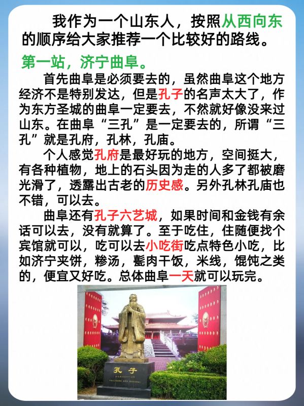 然后到曲阜市参观孔庙、孔林等儒家文化圣地,深入了解中国传统思想和道德规范。最后到临沂市游览黄河三峡风景区和费县红色旅游区,领略壮美自然风光和革命历史。