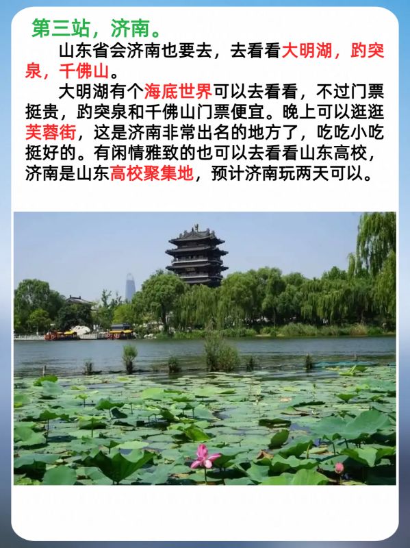 山东省会济南也要去,去看看大明湖,趵突泉,千佛山。大明湖有个海底世界可以去看看,不过门票挺贵,趵突泉和千佛山门票便宜。晚上可以逛逛芙蓉街,这是济南非常出名的地方了,吃吃小吃挺好的。有闲情雅致的也可以去看看山东高校,济南是山东高校聚集地,预计济南玩两天可以。