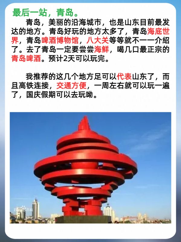 我推荐的这几个地方足可以代表山东了,而且高铁连接,交通方便,一周左右就可以玩一遍了,国庆假期可以去玩呦。
