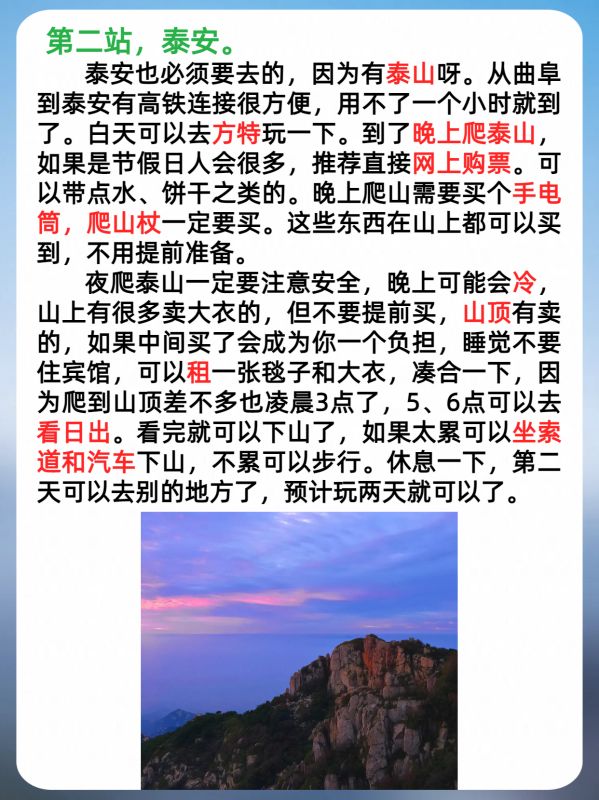 泰安也必须要去的,因为有泰山呀。从曲阜到泰安有高铁连接很方便,用不了一个小时就到了。白天可以去方特玩一下。到了晚上爬泰山,如果是节假日人会很多,推荐直接网上购票。可以提前带点水,饼干之类的。晚上爬山需要买个手电筒,爬山杖一定要买。这些东西在山上都可以买到,不用提前准备。夜爬泰山一定要注意安全,晚上可能会冷,山上有很多卖大衣的但不要提前买,山顶有卖的,如果中间买了会成为你一个负担,睡觉最好不要住宾馆,可以租一张毯子和大衣,凑合一下,因为爬到山顶差不多也凌晨3点了,5,6点可以去看日出,看完就可以下山了,如果太累可以坐索道和汽车下山,不累可以步行。休息一下,第二天可以去别的地方了,预计玩两天就可以了。