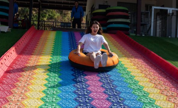 园区内有雨林水漂、彩虹滑道、卡丁车、高空溜索、玻璃旱滑等刺激项目。雨林水漂全长1788米,落差158米,可在急速下滑中欣赏寻梦谷美景,穿梭在山林之间,一路鸟语花香,犹如置身于天然氧吧之内。彩虹滑道则由五彩斑斓色彩铺设而成,远远眺望,好似一道彩虹卧于山间。超百米的玻璃滑道,每一段坡度都有所差别,让您体验不同坡度滑道带来的不同速度感。樱花卡丁车赛道,山林坡地的赛道,急弯与长路相互交叠,好像等待着前来征服的英雄,最适合亲子互动。高空溜索,水平长度约350米,上下站高差约为51米,吊在高空中,十里蓝山的全景一览无遗。