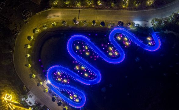 夜晚,十里蓝山长达1314米的“流星雨”线路贯穿景区主干道。夜景由“流星雨”、“彩虹灯带”、“星空许愿”、“时光隧道”、“音乐喷泉”、“水幕电影”、“山体投影”等十余个景点组成,遍布景区1100亩面积。走在园区的长廊上,跳动的灯光,增添了一份静谧、优雅。等到仙灵湖景观灯开启,五彩缤纷的灯光与水柱交相辉映,一场结合了音乐和灯光的水舞秀在这上演,如梦如幻。