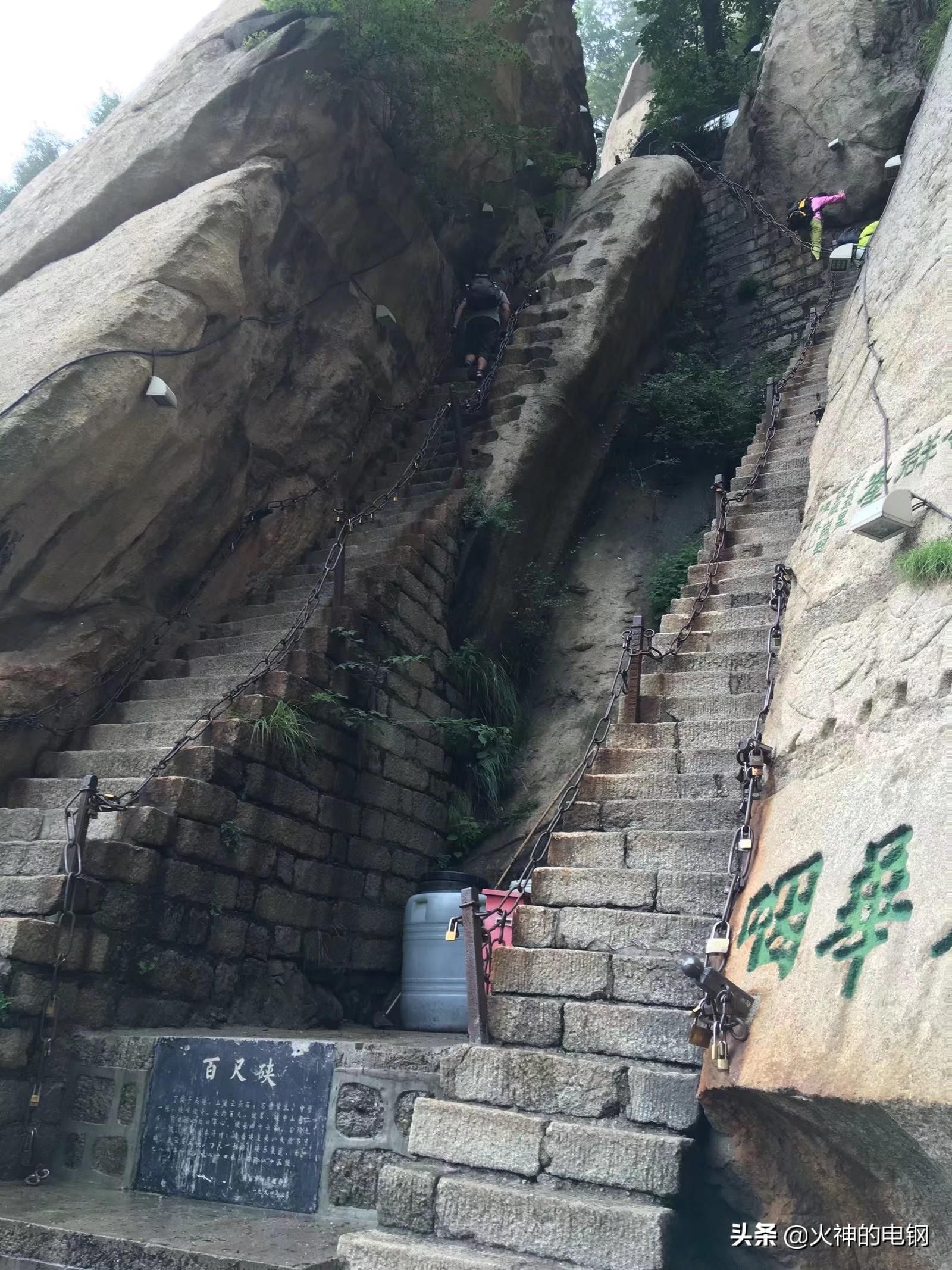 接着上到回心石,此后华山最险路“千尺幢”、“百尺峡”来到脚下,往上一望真的害怕,千尺幢接近90度垂直的路有大概200米,期间我抓住铁链小心往上爬,基本不敢往下看,走完上了一个小平台终于松了一口气,小平台再上是“百尺峡”,它比之前还陡峭,好在只有大概五十米,很快就上去了。我要说明的是,千尺幢和百尺峡不是必经路线,恐高的朋友可以走青虎路避开它们,量力而行。