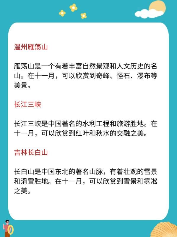 长江三峡:长江三峡是中国著名的水利工程和旅游胜地。在十一月,可以欣赏到红叶和秋水的交融之美。