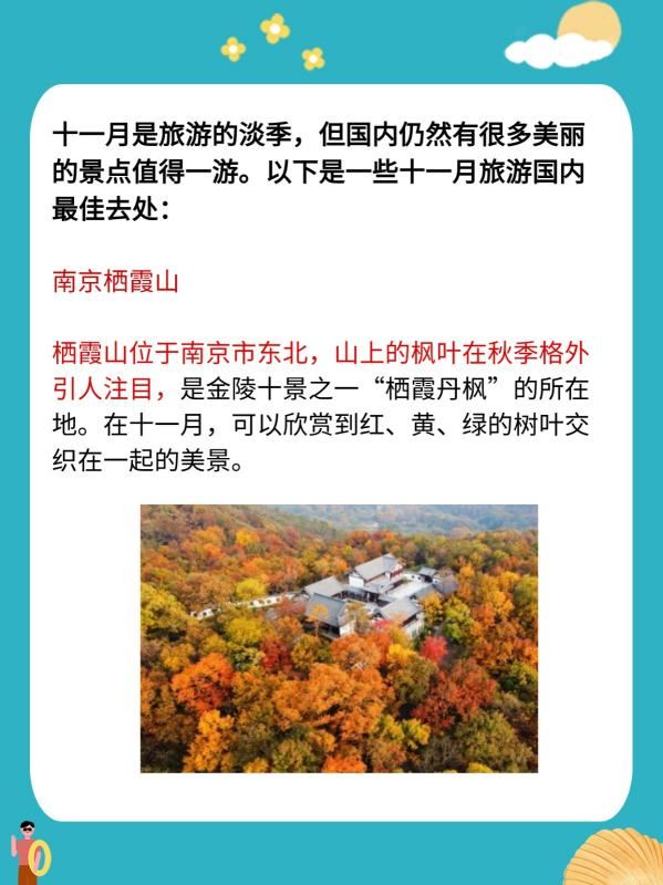 南京栖霞山:栖霞山位于南京市东北,山上的枫叶在秋季格外引人注目,是金陵十景之一“栖霞丹枫”的所在地。在十一月,可以欣赏到红、黄、绿的树叶交织在一起的美景。