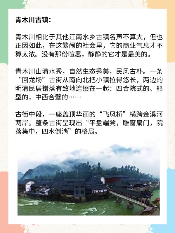 青木川古镇位于汉中市宁强县,非常有特色,文化气息浓厚,民风淳朴,当地的民众依山傍水而劳作,生活节奏特别慢。古镇的历史人文资源丰厚,传统的老街区、民风民俗、以及人们的生活方式,都充满了浓郁的风情画意;而它的古建筑、古词题刻等等,更是向世人展现了古镇悠久的历史和深厚的文化底蕴。