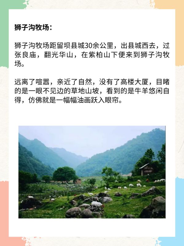狮子沟牧场距留坝县城30余公里,出县城西去,过张良庙,翻光华山,在紫柏山下便来到狮子沟牧场。