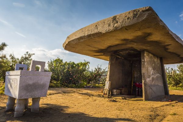 二处位于仙人岛新区二台乡的石棚山上,形式同前者,但规模比前者大,高2.6米,上覆盖一块巨石,长8.6米,宽5.7米,厚0.7米,是国家级文物保护单位。