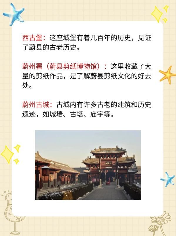 蔚州署(蔚县剪纸博物馆):这里收藏了大量的剪纸作品,是了解蔚县剪纸文化的好去处。