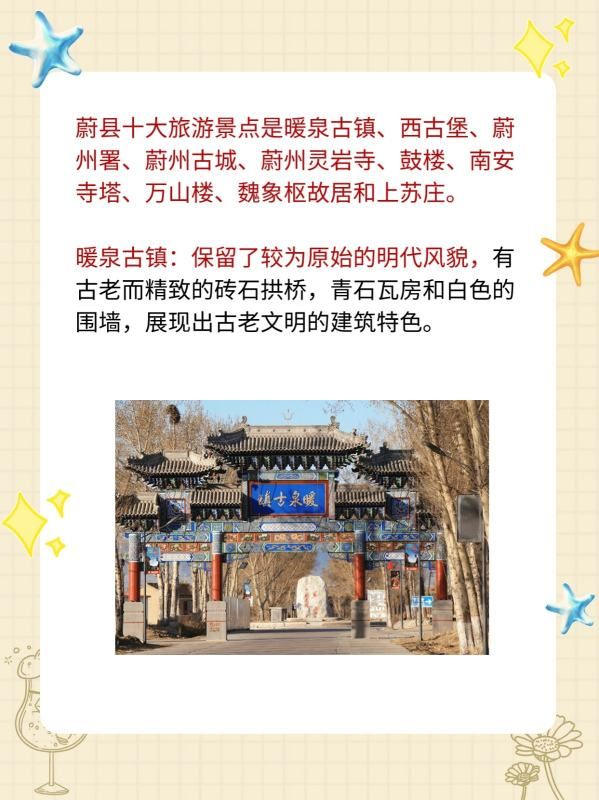 蔚县十大旅游景点是暖泉古镇、西古堡、蔚州署、蔚州古城、蔚州灵岩寺、鼓楼、南安寺塔、万山楼、魏象枢故居和上苏庄。
