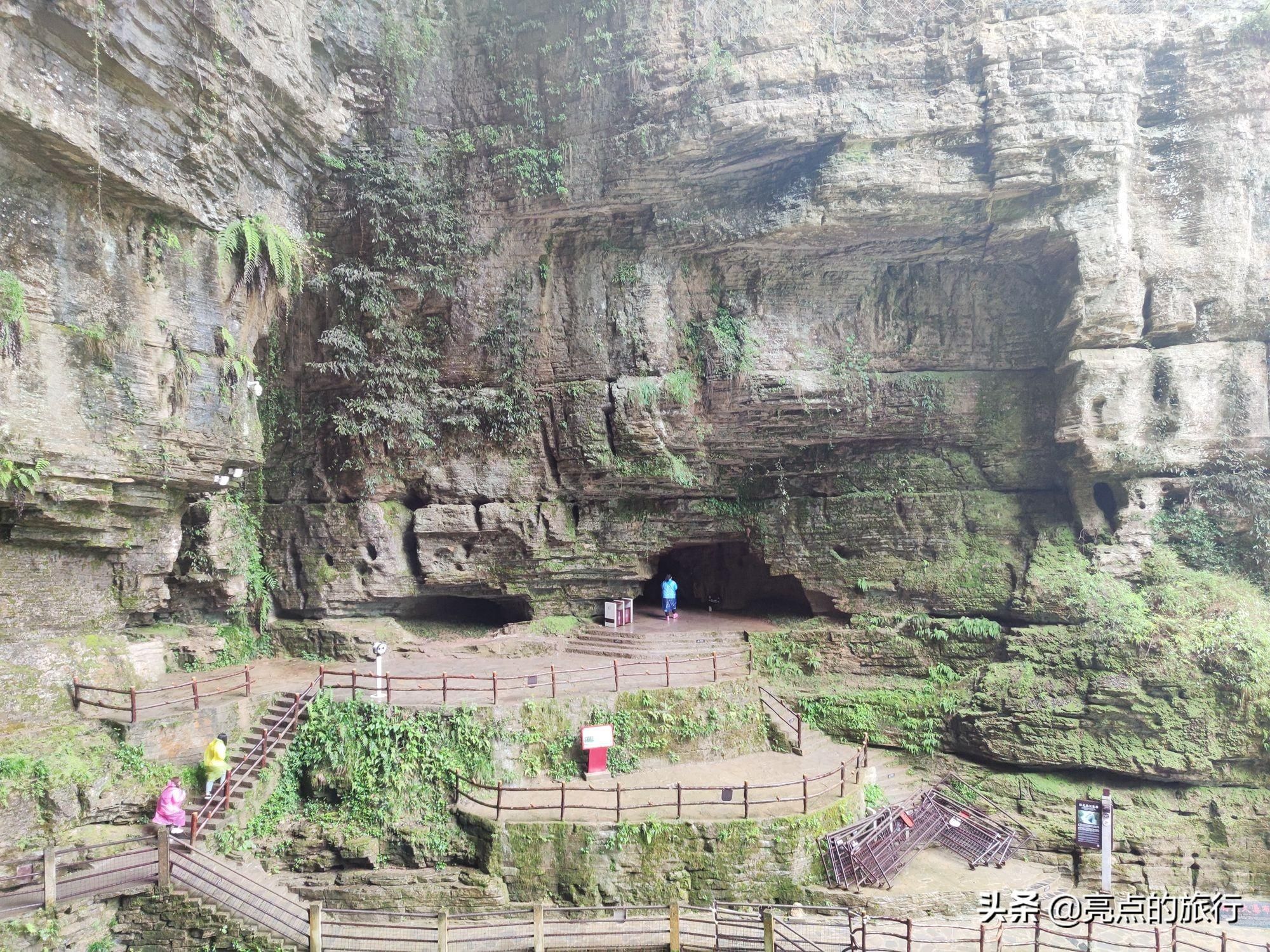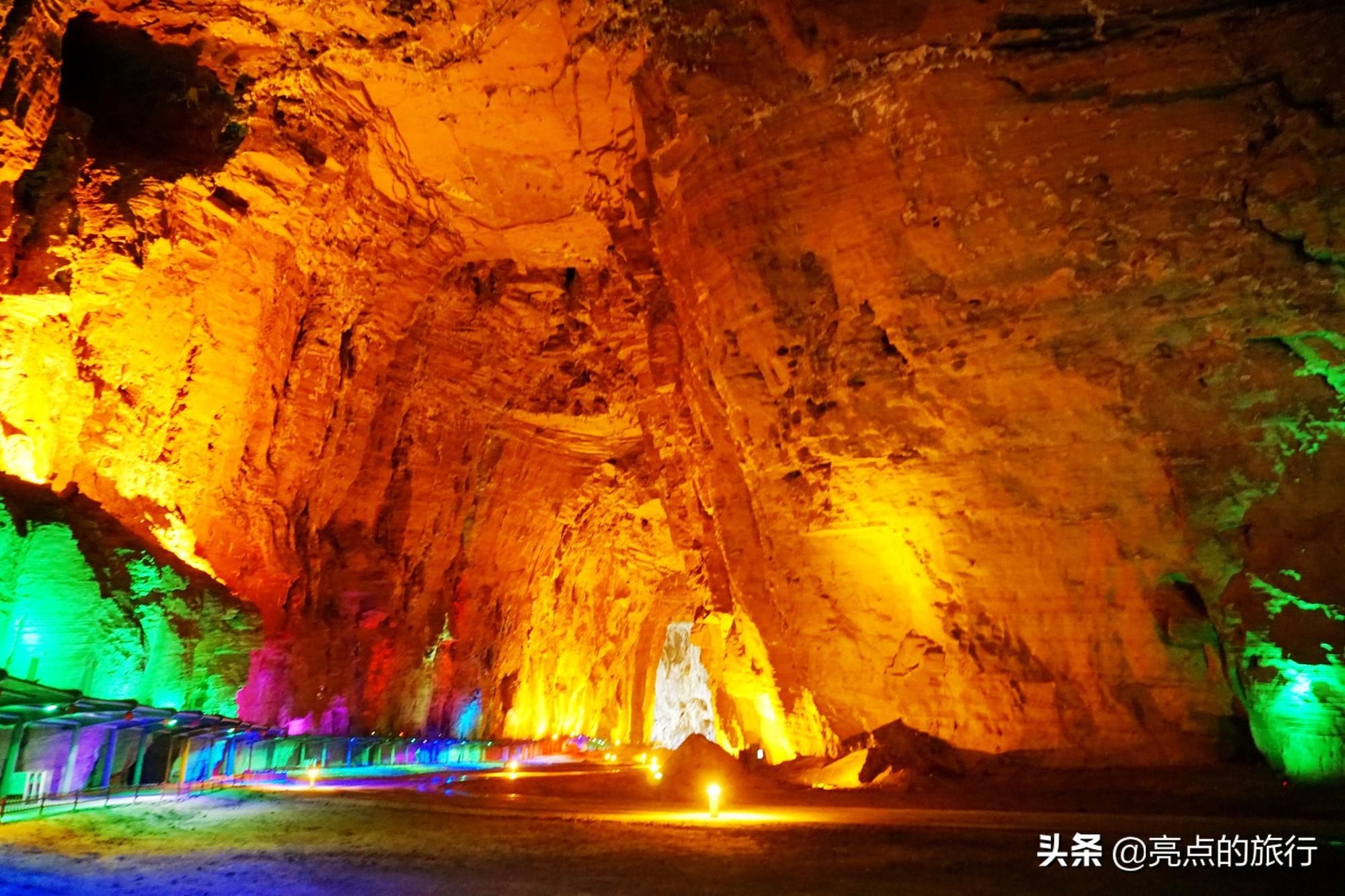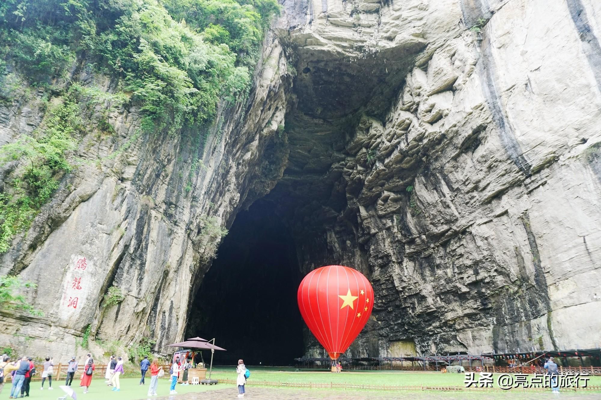 还没到达腾龙洞就已看到空中高悬的热气球。初见腾龙洞,一定会被洞口的巍峨气魄所折服。腾龙洞有最宏大的洞口,高72米,宽64米,开阔处可以并行20辆卡车,可以容纳一栋20层的建筑,甚至可以让直升飞机在洞口自由盘旋。