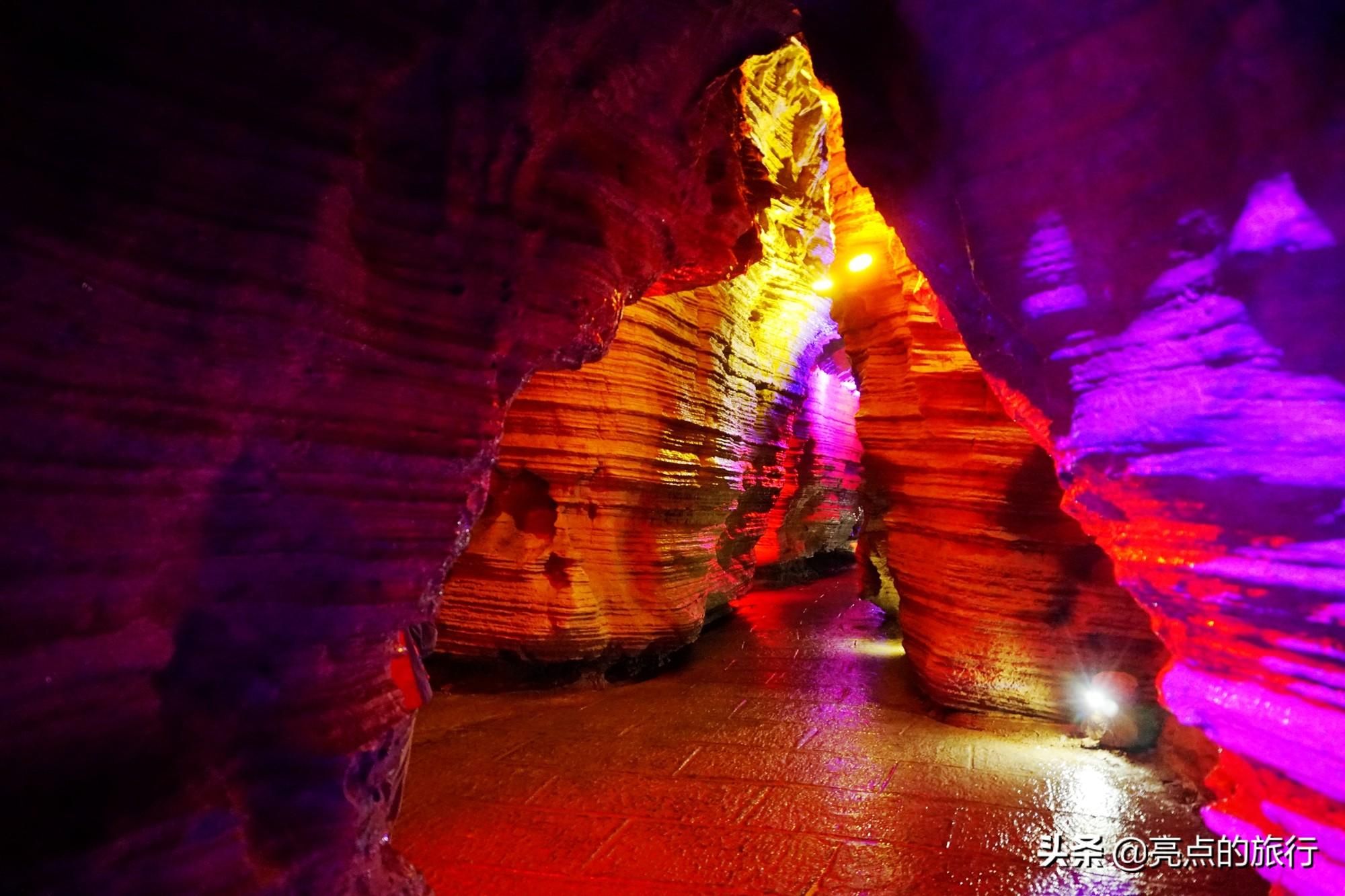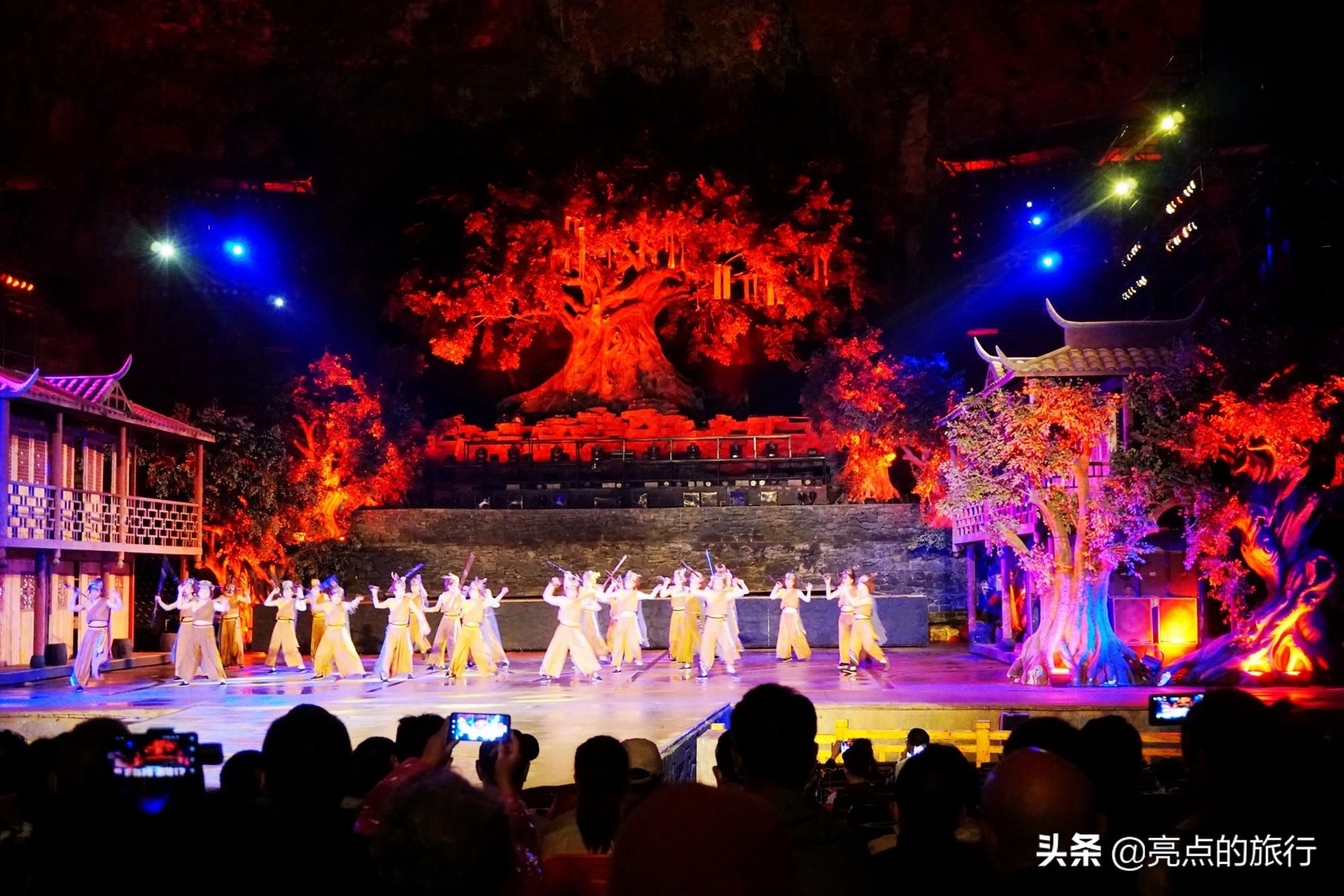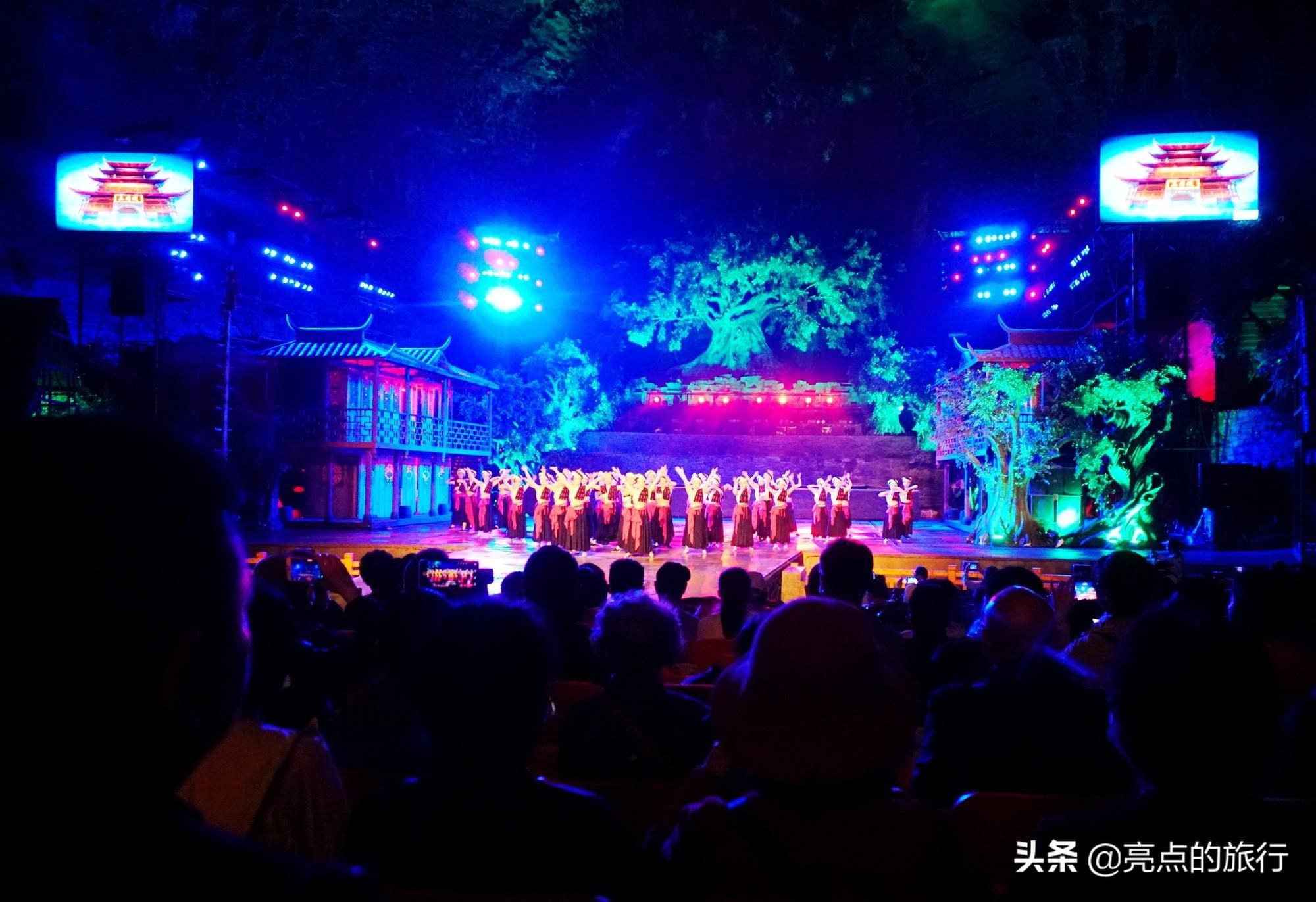 激光秀表演20分钟左右,大型歌舞表演1小时左右,两个表演剧场步行需要30分钟左右。景区内从洞口到灯光秀剧场有电瓶车,行程10分钟,景区内电瓶车每次10元。